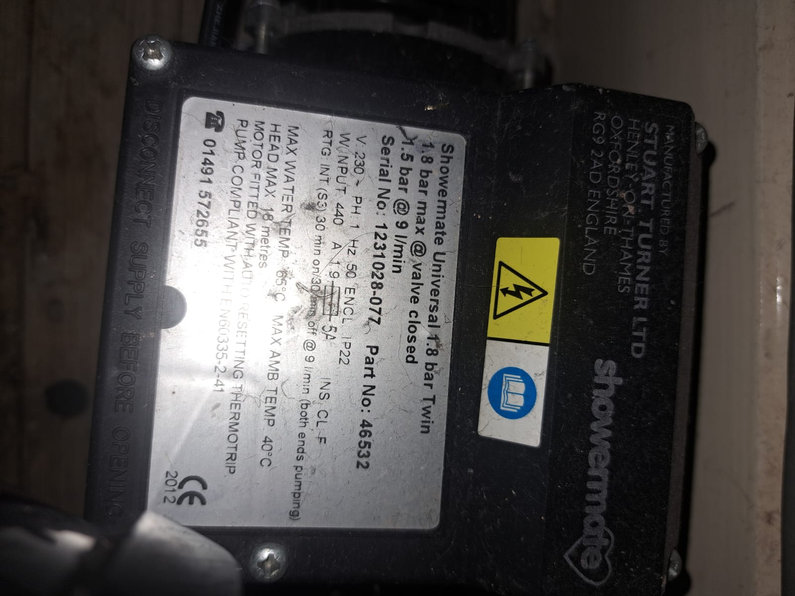 The pump is situated on the floor next to the hot water cylinder, on the floor below the loft conversion, it has dedicated supplies from the cylinder and the cold water storage tank.