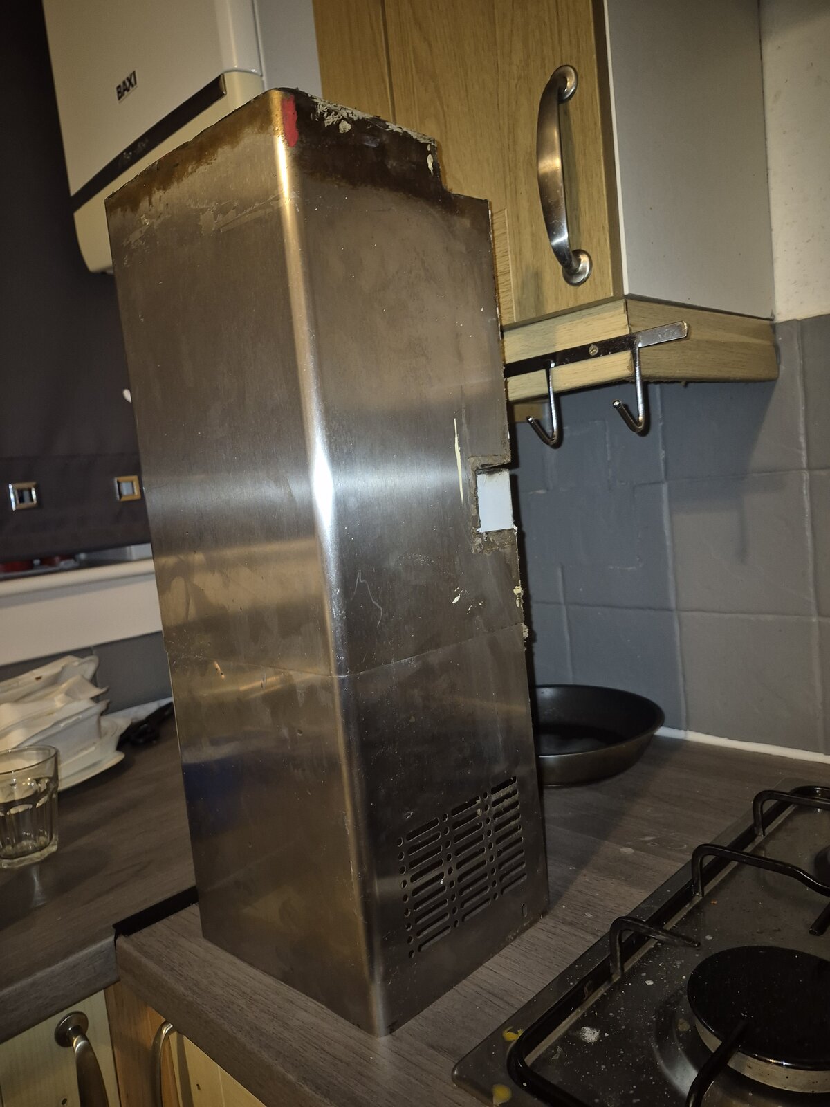 and to fit part 17 ie the cover they put a hole in the false kitchen ceiling which then allowed the fumes to travel straight into the space between the false kitchen ceiling and the real kitchen ceiling and traveling to my neighbours bedroom.