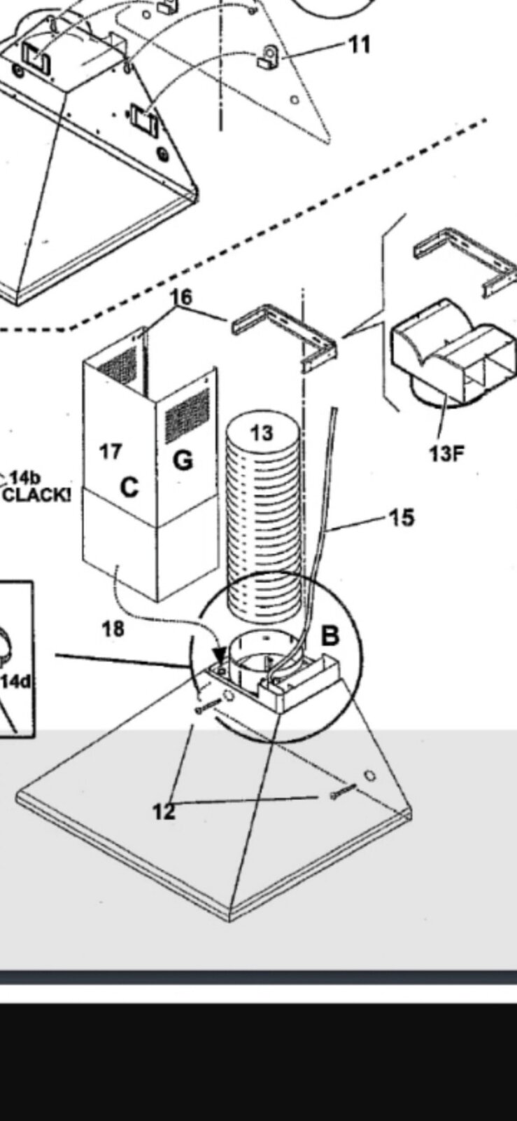 Now looking at the diagram on the manual and the actual pictures. It is missing part 13, the long tunnel thing that's suppose to go up the fan chimney and missing 13f and 16 and also part 17 is on upside down!!!! It's off at the moment but that's the way it was fitted. Either installed totally incompetently or there was no room at the top between the ceiling and the hood that they have just improvised and came up with that.