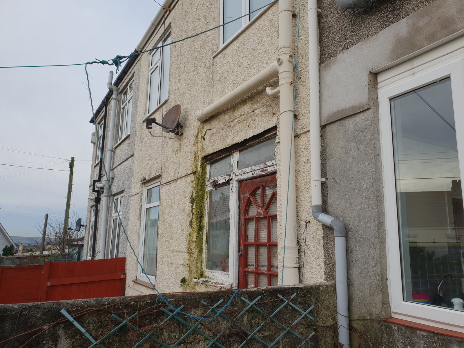 Ok, here is the photo, sorry it took so long to get to you, I had to wait until he was out, its an over the fence job, sorry its not particularly good quality / clear. As you can see the top piece of wood is fairly rotten, the soil stack is leaking causing more rot to the upright and the window and door is generally in a state of disrepair. My question is, is this structurally ok, you can see from the photo a crack is appearing above this area. My only concern here is that this may affect my house in some way, you can see from the photo its fairly close to the party wall. The visual aspect I can put up with, I don't plan on selling any time soon and a 6 foot fence will easily stop my having to look at the damn thing. But I am more concerned the wooden frame on this arrangement is somehow structural and if it rots anymore that cracking will get worse / affect my property also.