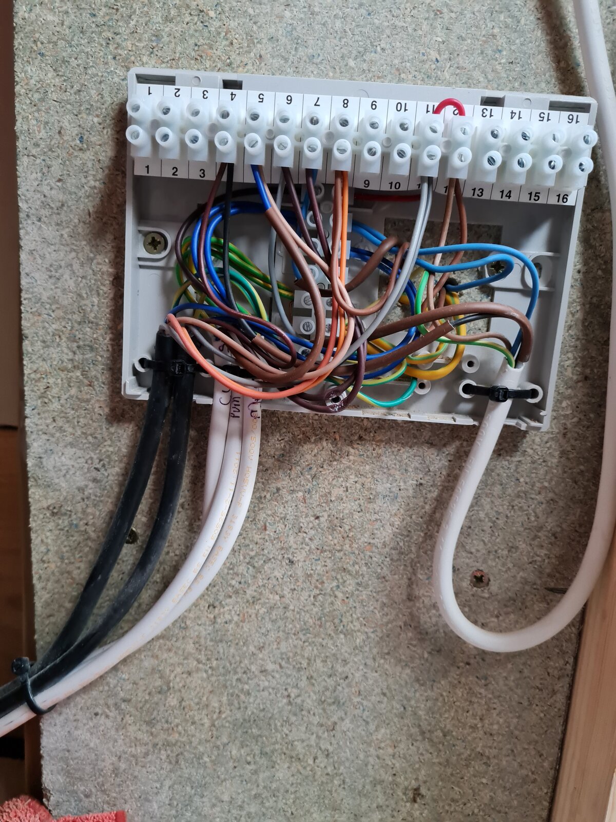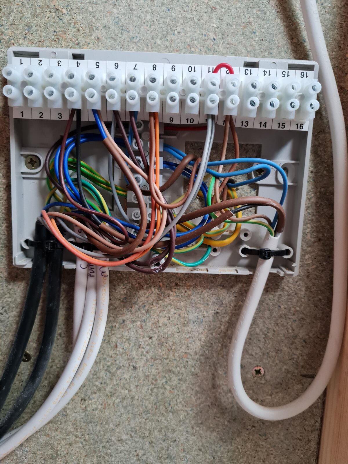 That aside, the wiring centre doesn't look too bad, I've seen a lot worse. The cables are secured with cable ties to some extent, although it would have come with proper cable clamps similar to those in a 13A plug. The Nest Heat link is a bit of a rats nest, but if the wires are secure and don't have exposed conductors, they are likely to be OK. However, you will have the chance to get it tidied if you install Tado.