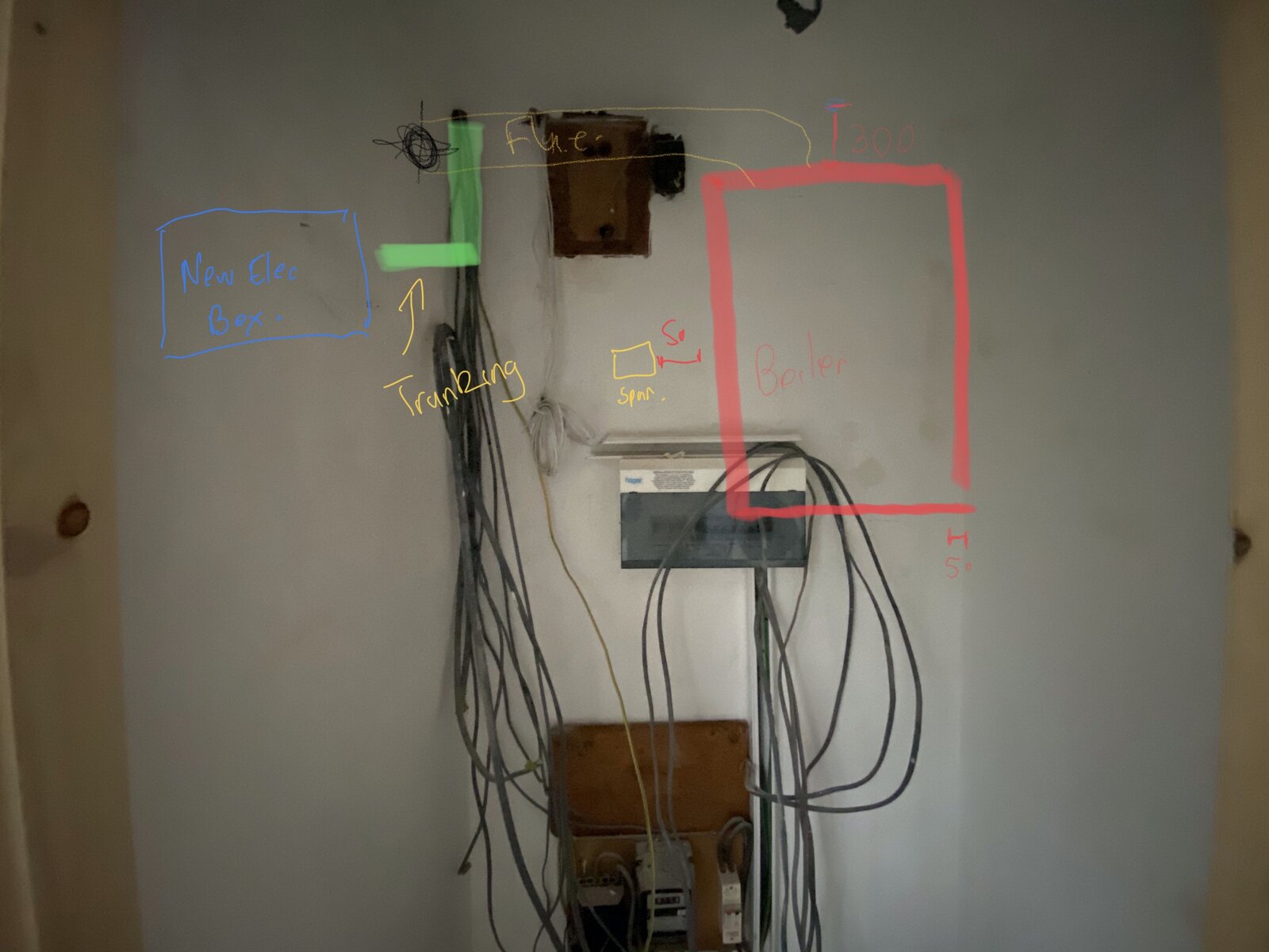 now the question is . The electrician has got wires from first fix. And is bringing them in the same corner the boiler flu is going. I am fitting a 25kw integrals rapid. I want the flue to be in the corner and as high as it can be.