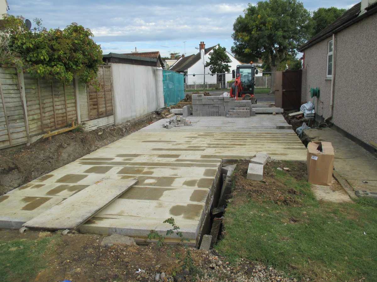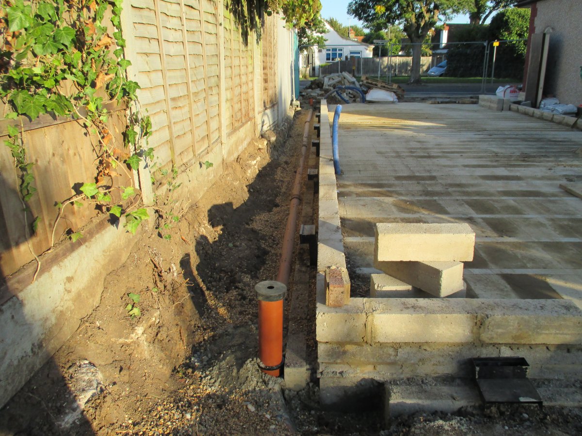 Drainage for the roof surface rain water to the back garden soakaway then levelling the rear garden for a flatter level as the garden was a deep slope. Ha s to do this while we can use the digger before building the timber frame