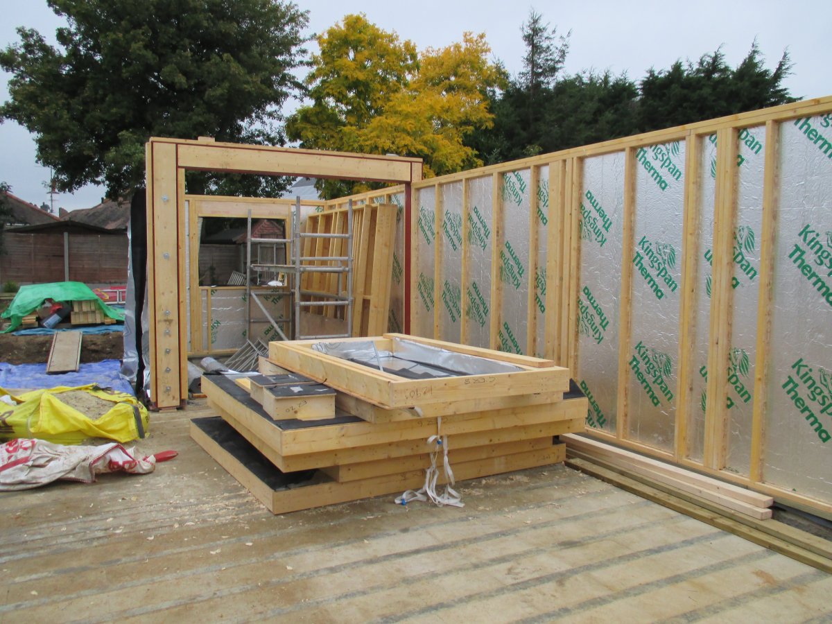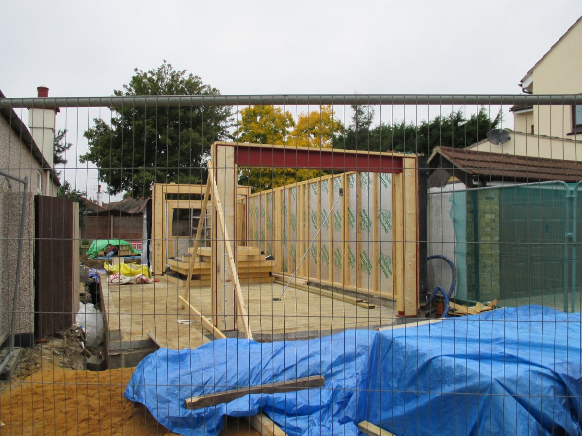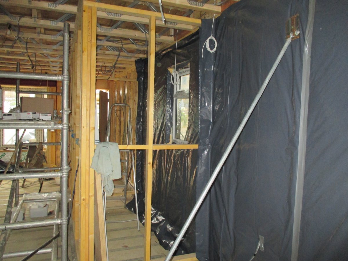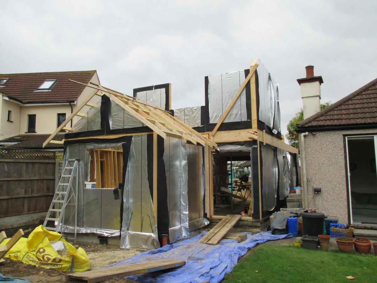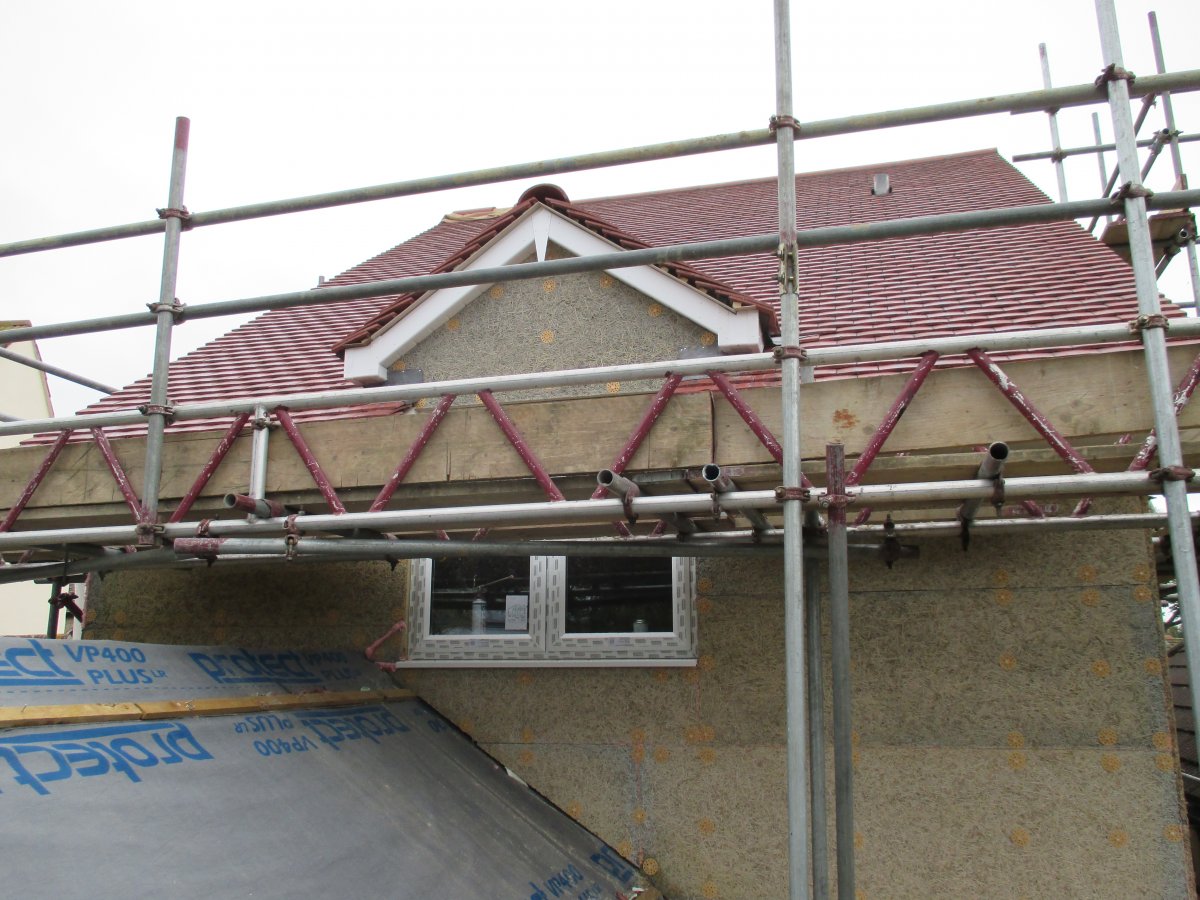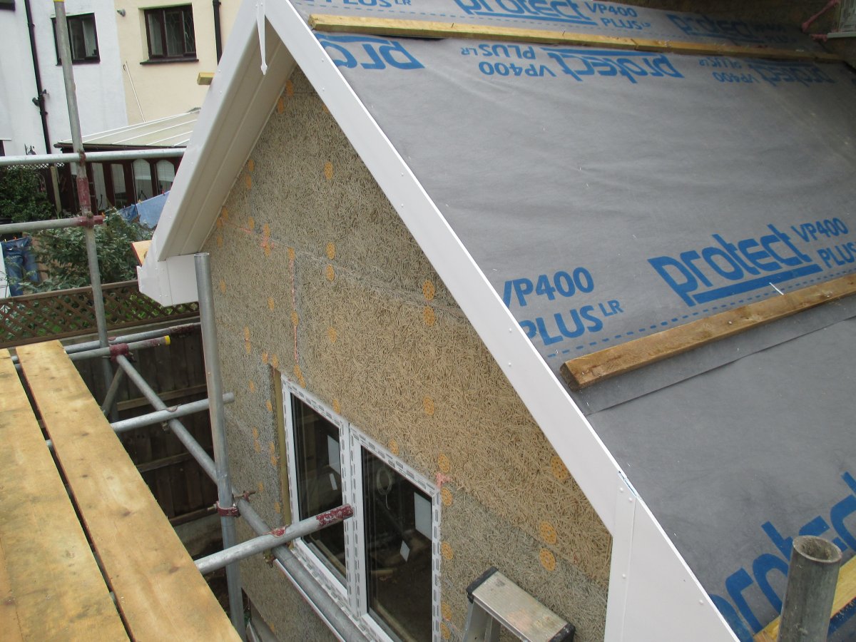 Wall insulation in the timber frame section with vapour barrier, finishing the roof tiles to make it weather tight ready for plaster boarding, electrician 1st fixing's done