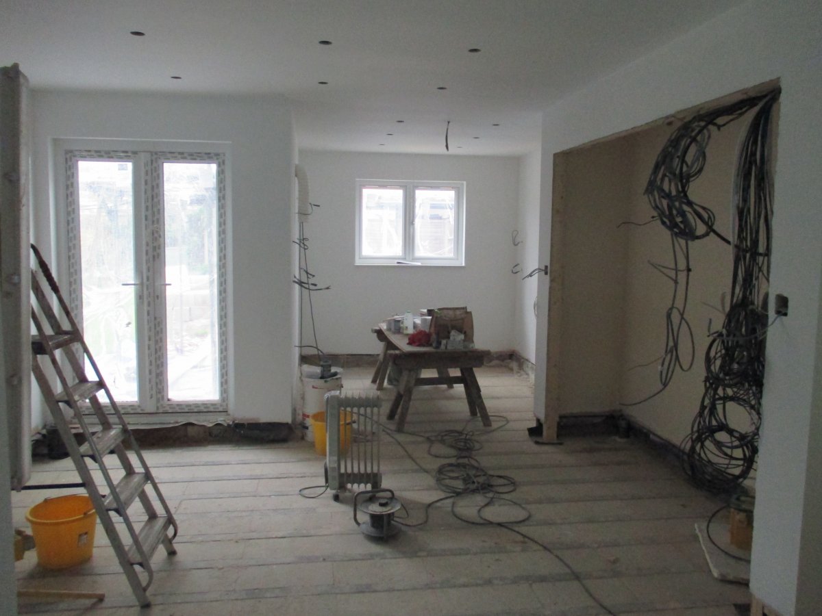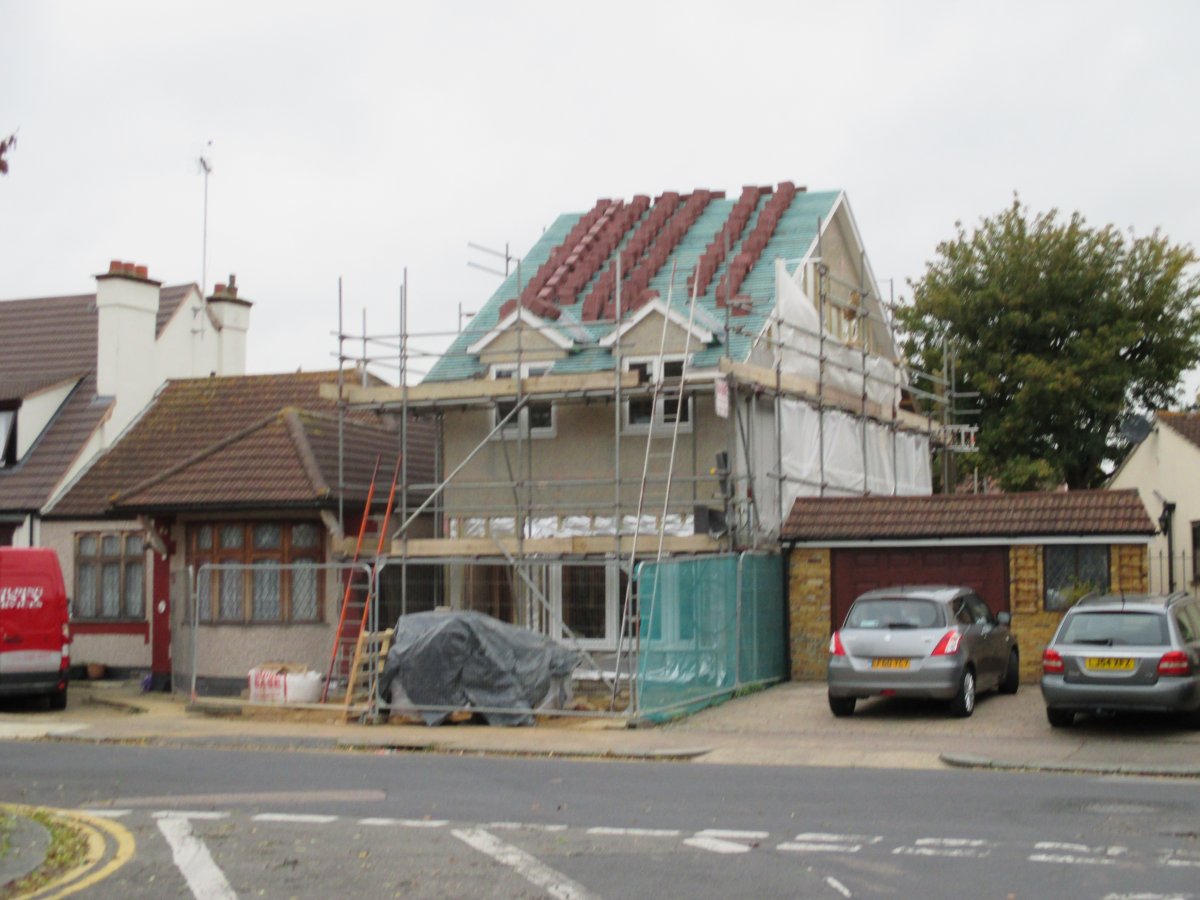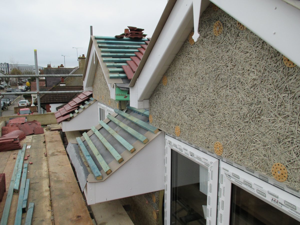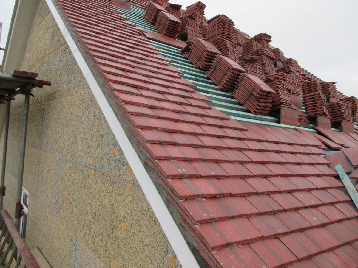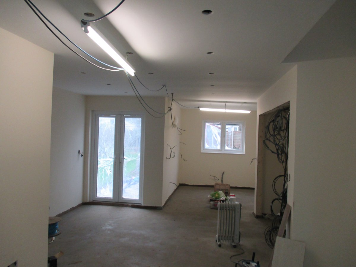 Wall insulation in the timber frame section with vapour barrier, finishing the roof tiles to make it weather tight ready for plaster boarding, electrician 1st fixing's done