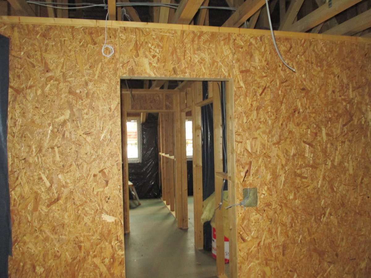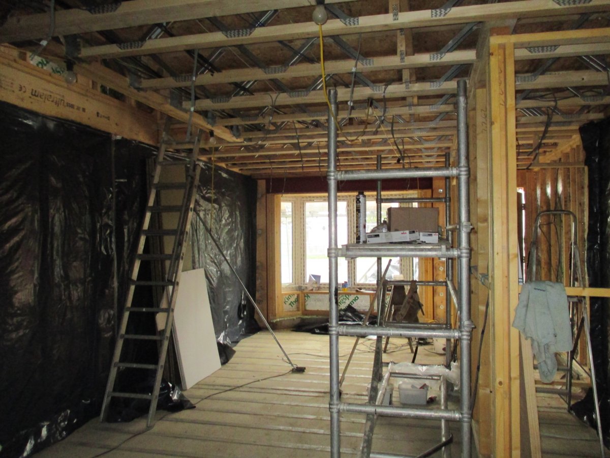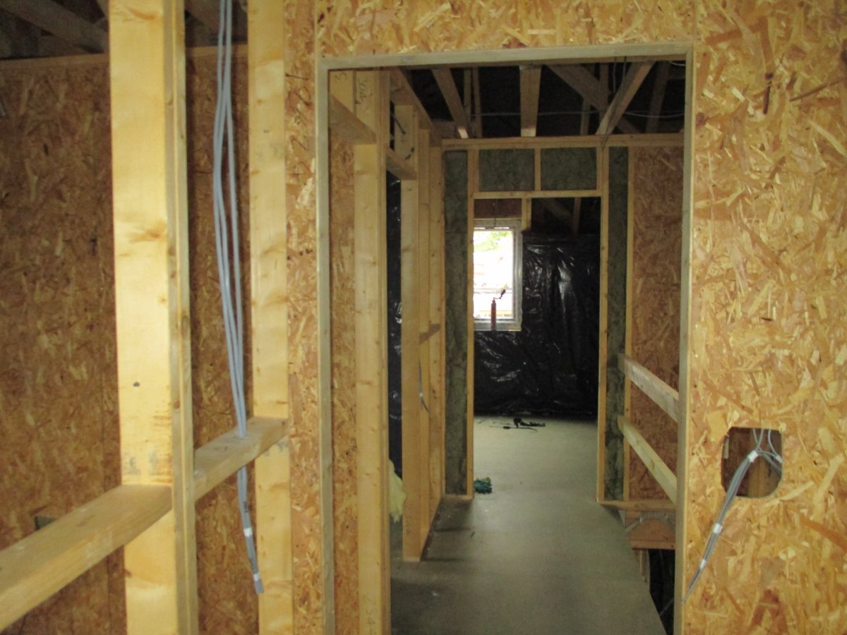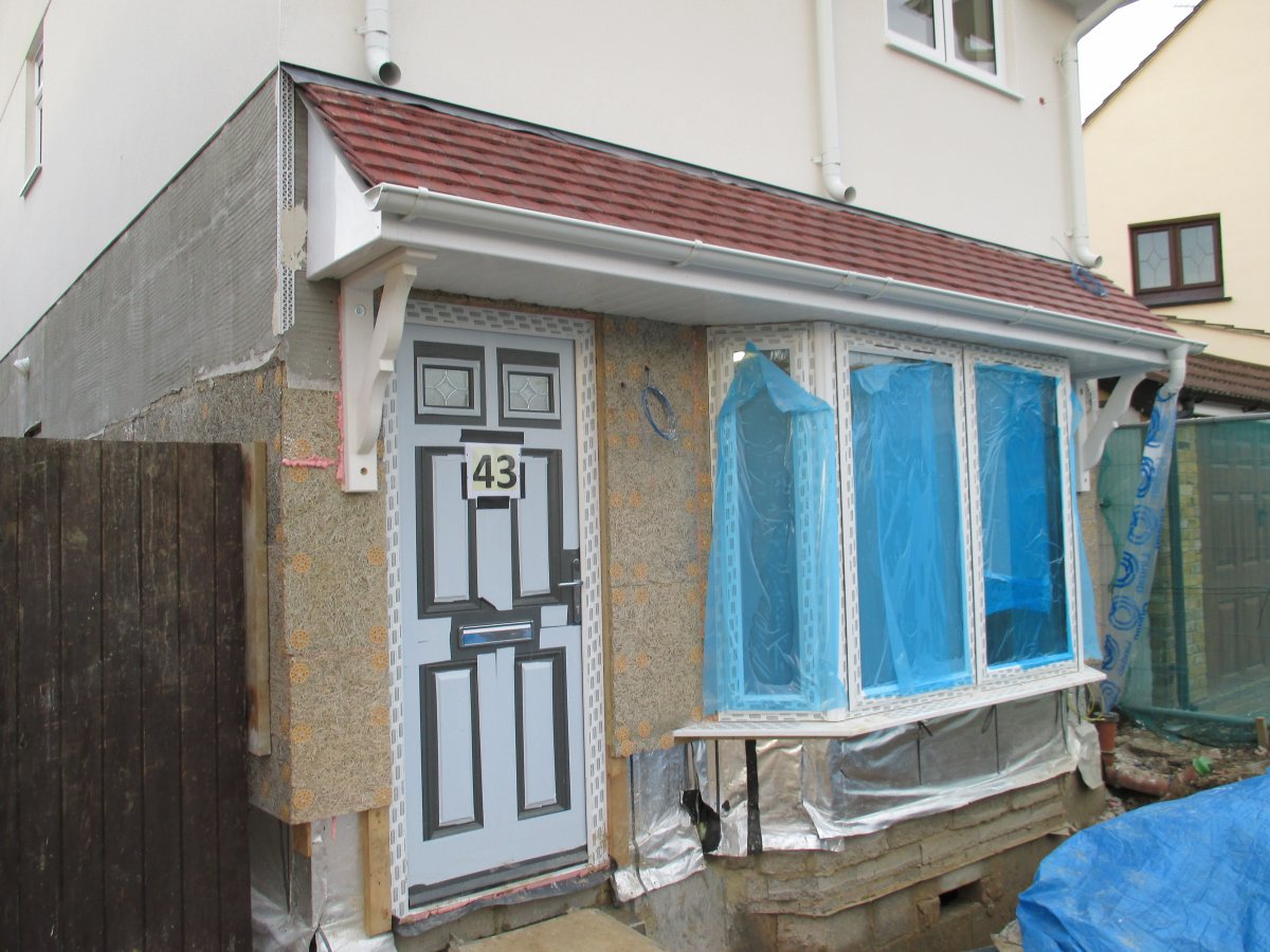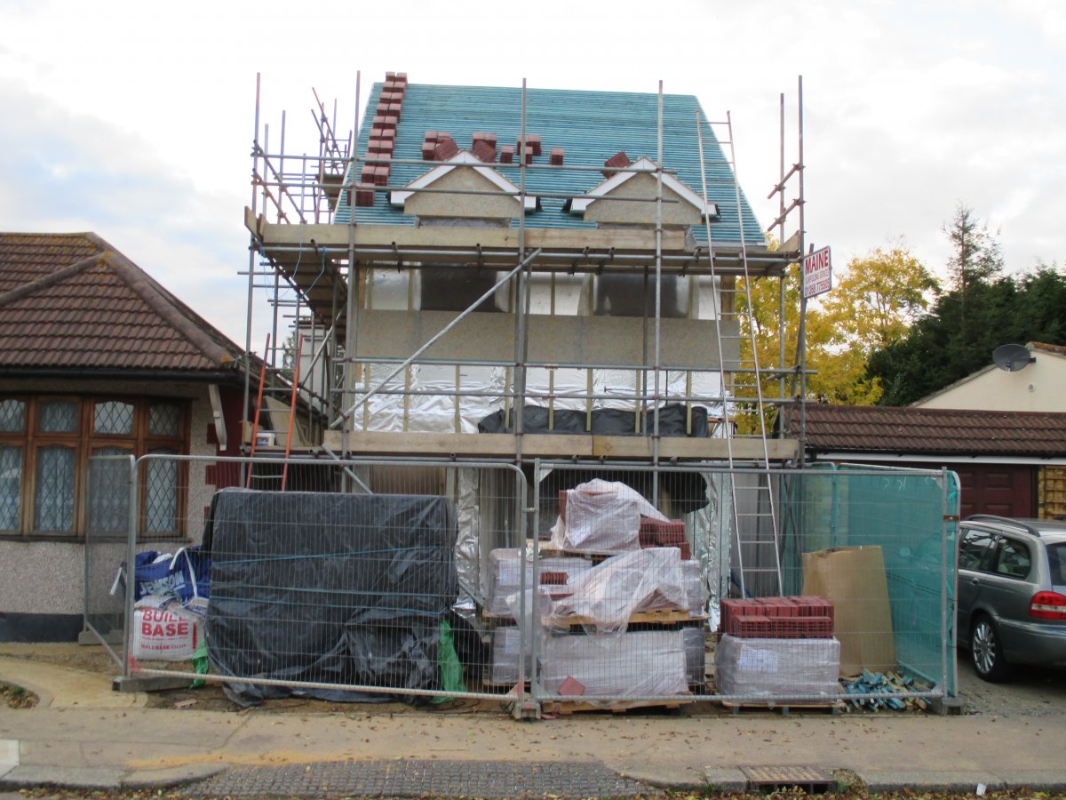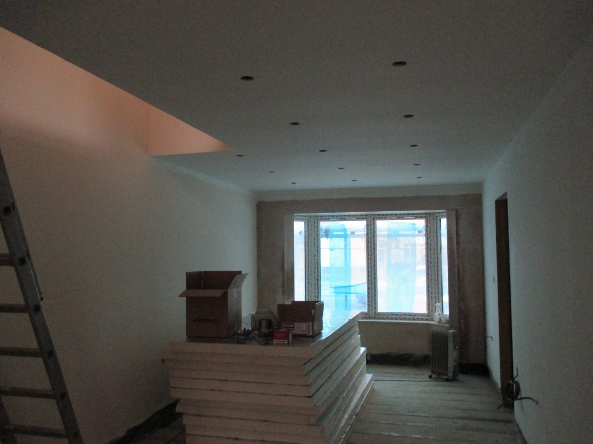 Wall insulation in the timber frame section with vapour barrier, finishing the roof tiles to make it weather tight ready for plaster boarding, electrician 1st fixing's done
