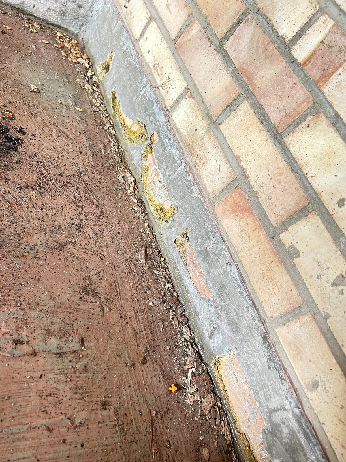 The old owner clearly tried to apply tanking material to the first two courses of brick work but this has cracked and fallen off over last two years. Not sure if this was a good idea or not.