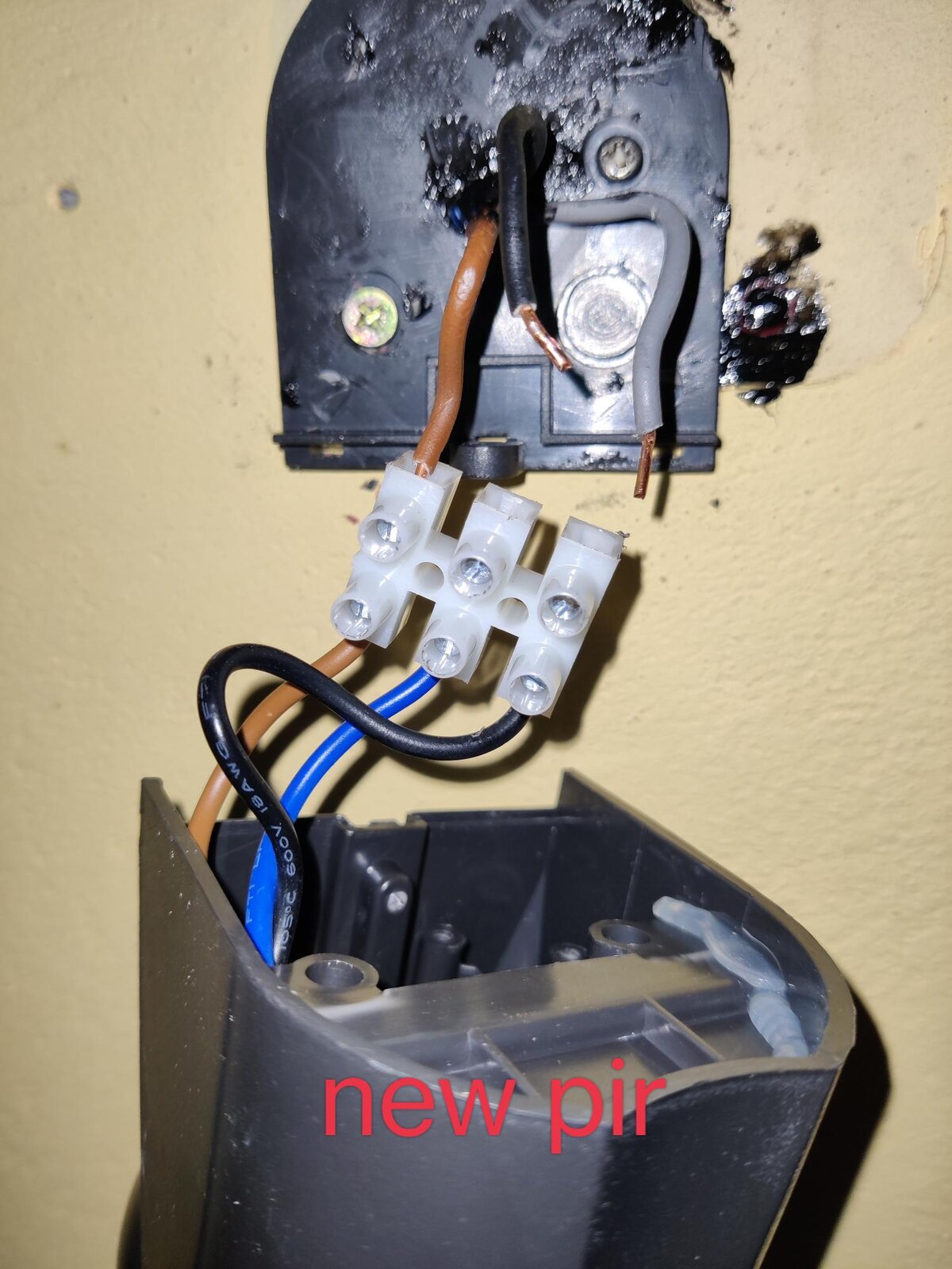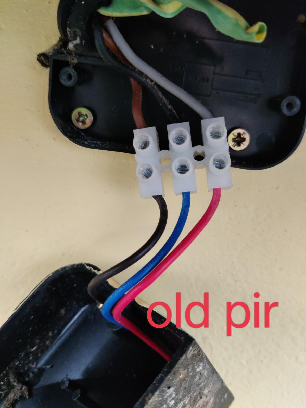 original wiring from 1998, the (broken?) pir looks much newer, the replacement has different colours....