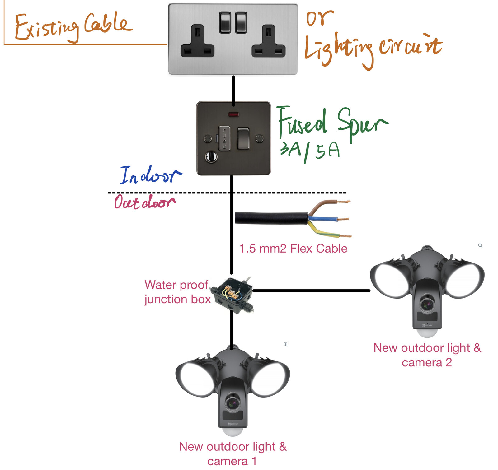 Hi, I'm looking to install outdoor lights on the exterior of my house. Please check the sketch attached - is this correct and safe for the installation?