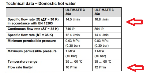 Now where you say they advertise 12l/min, they do not. You just don't know how to read a technical manual. They are required to state a flow rate at 35 degree rise, its not a statement of what the flow rate is, flow rate will be dependant on a number of factors, plenty boilers are fitted on supplies that cant flow enough water to reach the full flow for example. The manual states what restricter is fitted, its the person who specifies the boilers job to arrange and fit one to whatever spec they have agreed with you.
