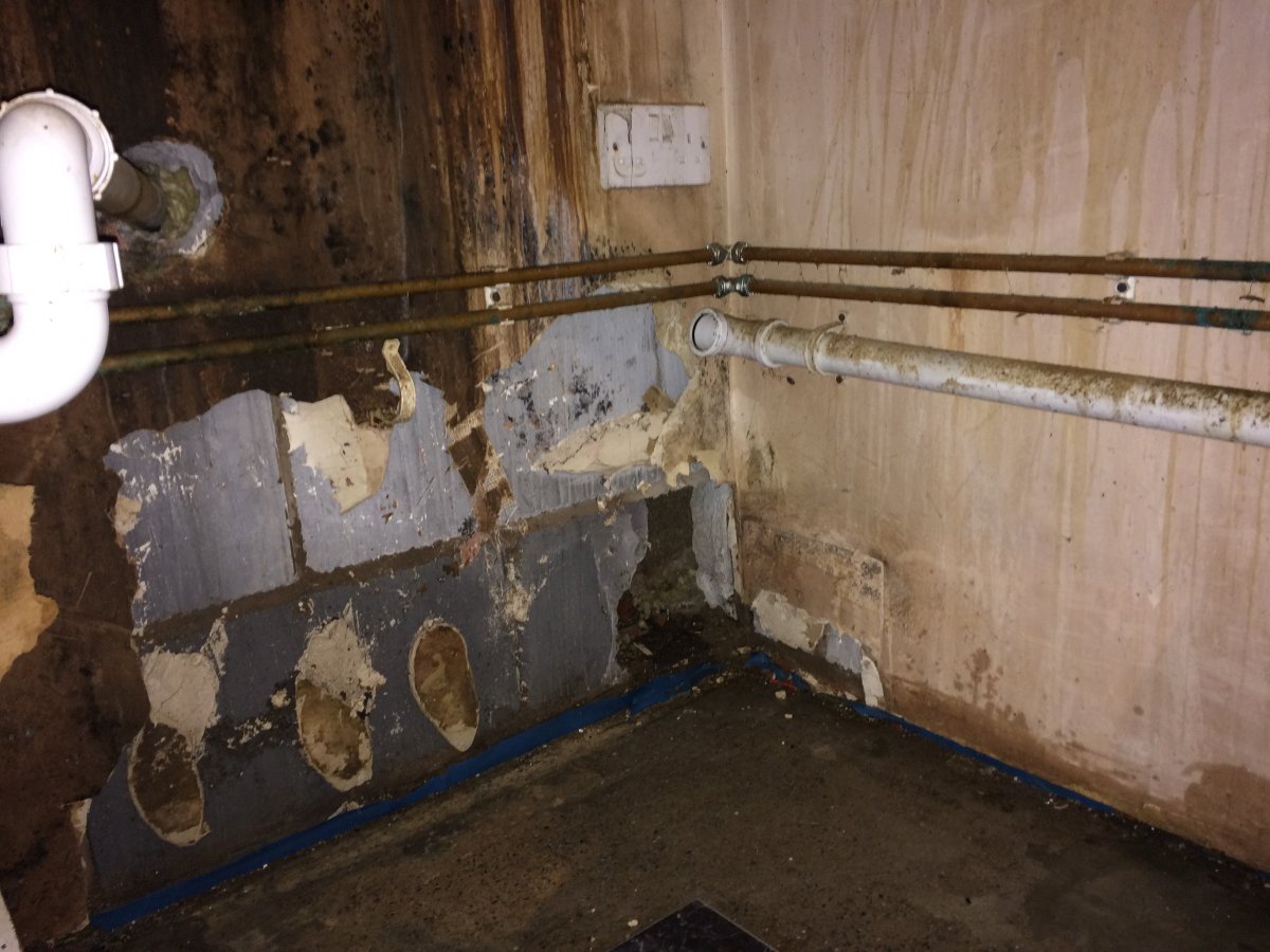 I started moving all the base units myself 1 by 1 so i could do any repairing needed on the wall as I suspected there may be one or two mice holes, everything was normal i blocked couple of holes with mortar i also put steel wool before blocking them off, untill i got the wall behind the sink. Whole plastering was damp/soaking with water passing through the the gap between worktop and the wall, so no surprise there i thought i just get the whole plastering off and put new plastering, now when i got the plater board off i could see there is a half a brick/ concrete block missing. Wall is only about 15 years old and there's no crumbling, first I thought it could be just bad workmanship, i thiught i would just put a brick in there myself, than on closer inspection i could see that the brick was originally there but than some part of it was broken and taken out, i would say around one third was missing, i put my hand in the cavity on one side there in insulation on the other side there's none. No insulation either below foundation level and my surprise the insulation, when i put my hand up are all wet.