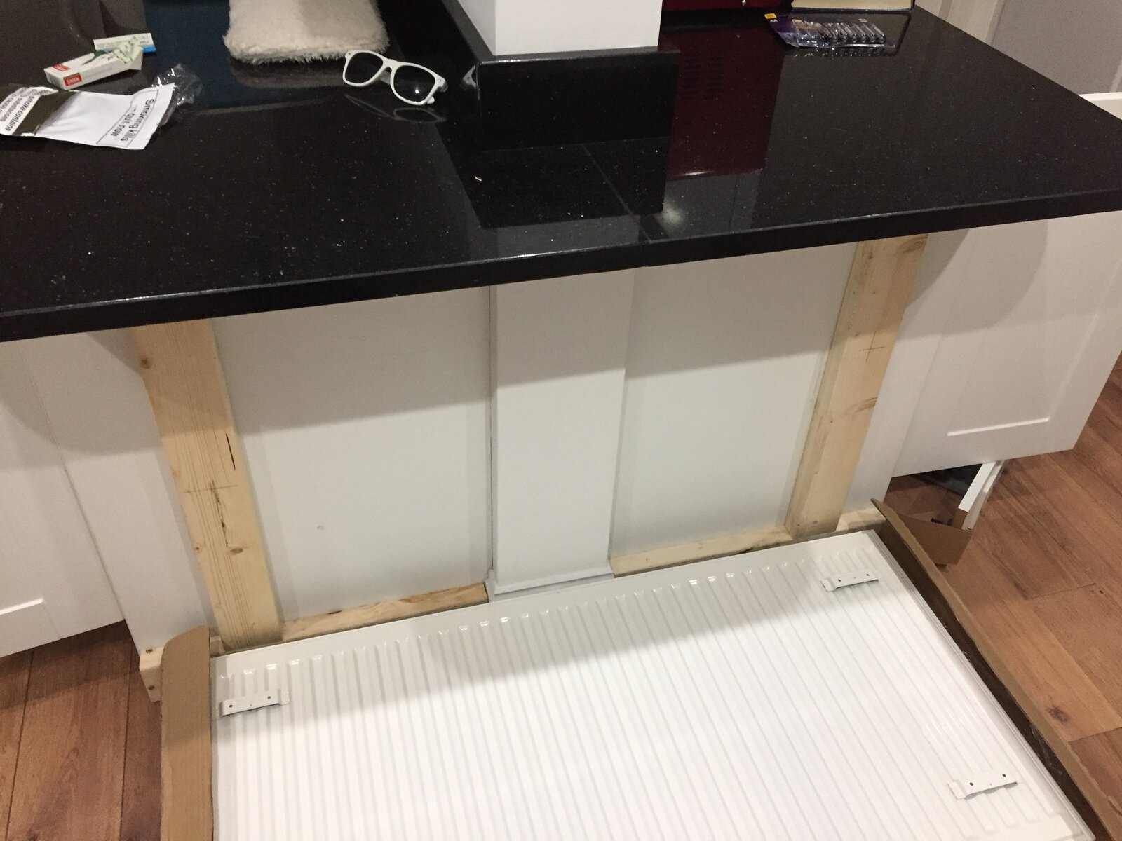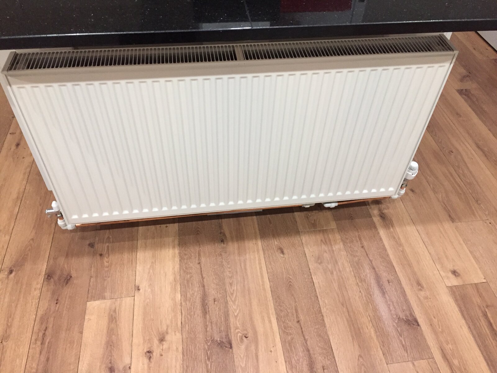 I will be screwing some battens of wood to the side of kitchen cabinets and hang the radiator on that under a quartz (I think) worktop, i’ll be using some radiator reflective foil under the worktop to be sure as there is a joint right above it