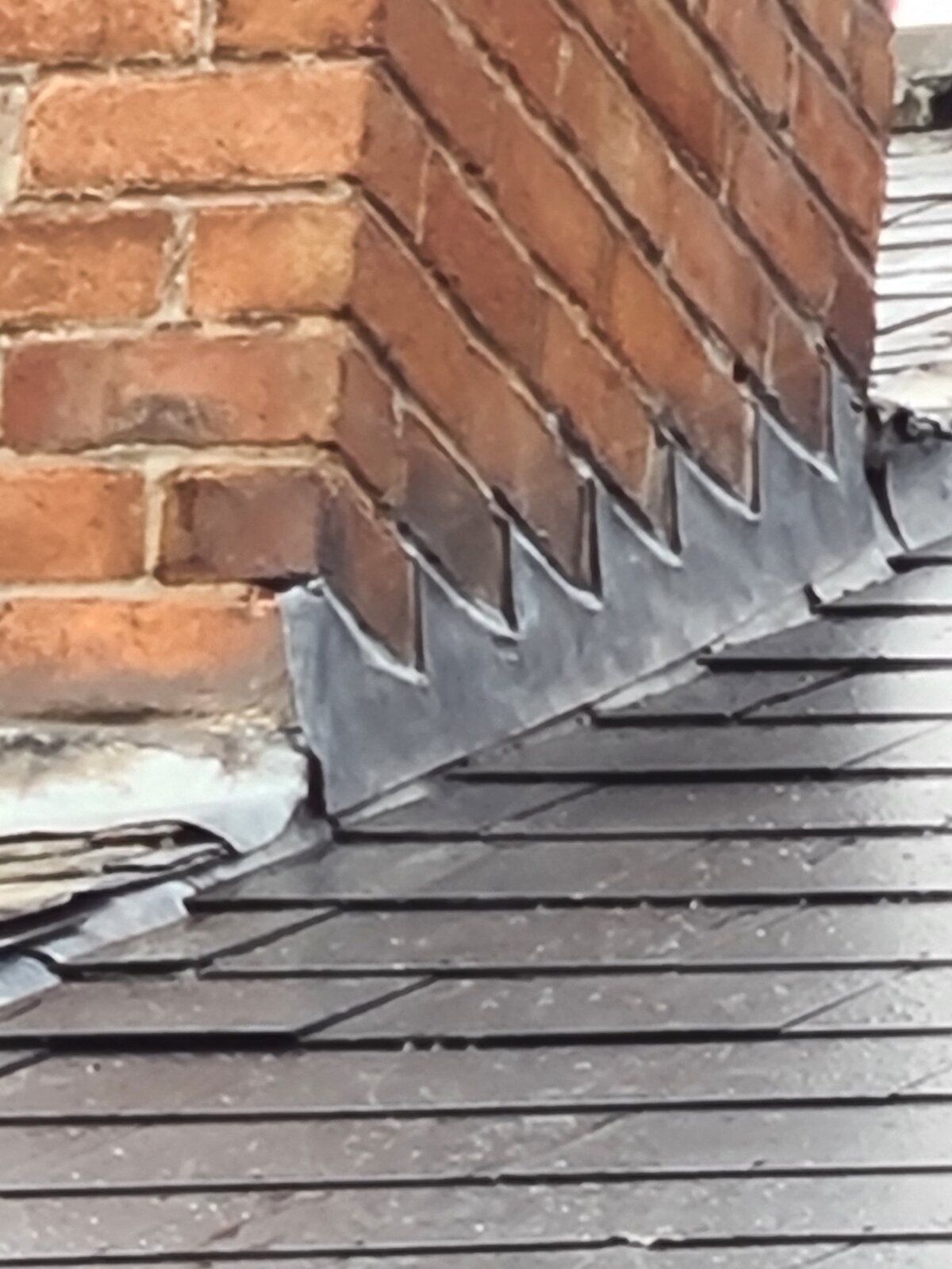Lead wedges holding the stepped flashing in place are proud of the surface and should be tapped back to allow pointing neatly or smooth continuous lead mastic. As the step flashing does not extend around the front of the chimney there is a point exposed which could let water in