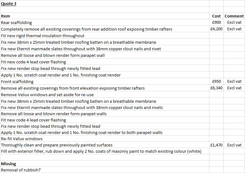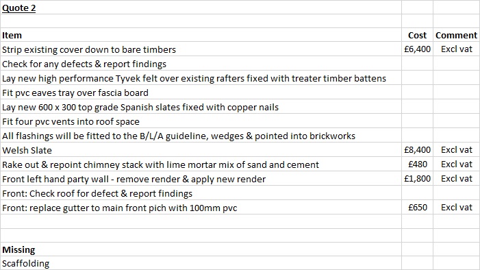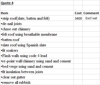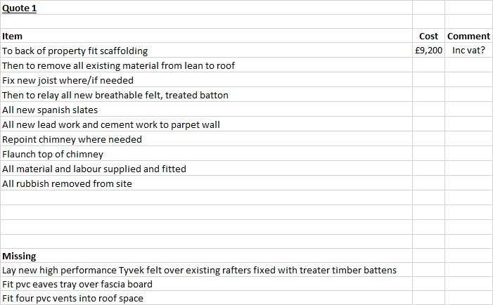 I am a home owner and have a mid terraced Victorian house in London. The back roof needs replacing (over 100 years old, minor leaks). I've got four quotes but since I'm not an expert I don't know what I should be asking these guys, what material they should use etc. Can anyone help?