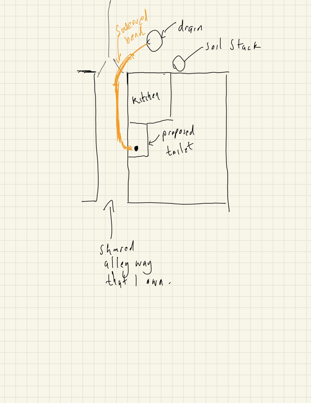 Not everyone’s cup of tea but I have a similar layout and I’ve added (in red) what I have - and I chose the easy option not having any manholes. A Saniflo. 22mm copper pipe clipped to my flank wall going into my soil stack.