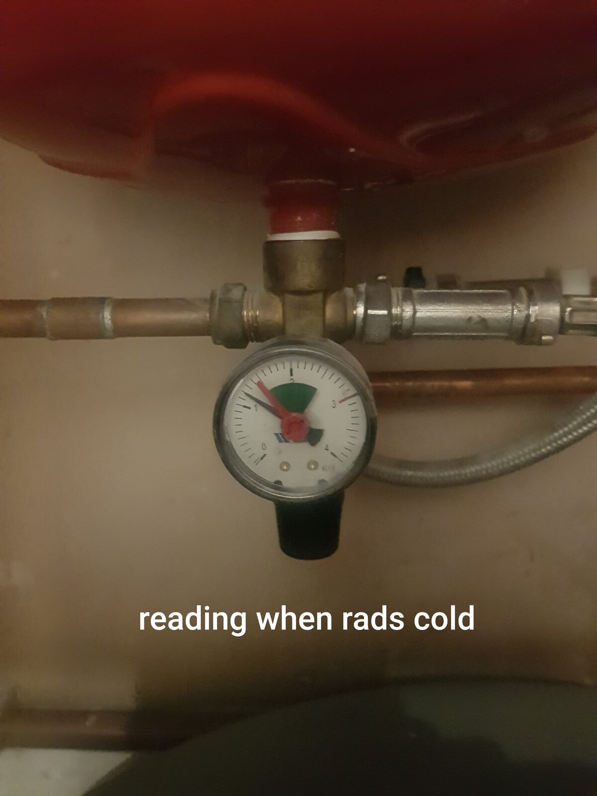 Assuming a 12L E.vessel and pre/fill pressures of 1.0/1.2bar then the final pressure will be 1.5bar with a hot 75L system, you can see the E.vessel volume and you know the number of rads so can make a good estimate of final pressure once known.