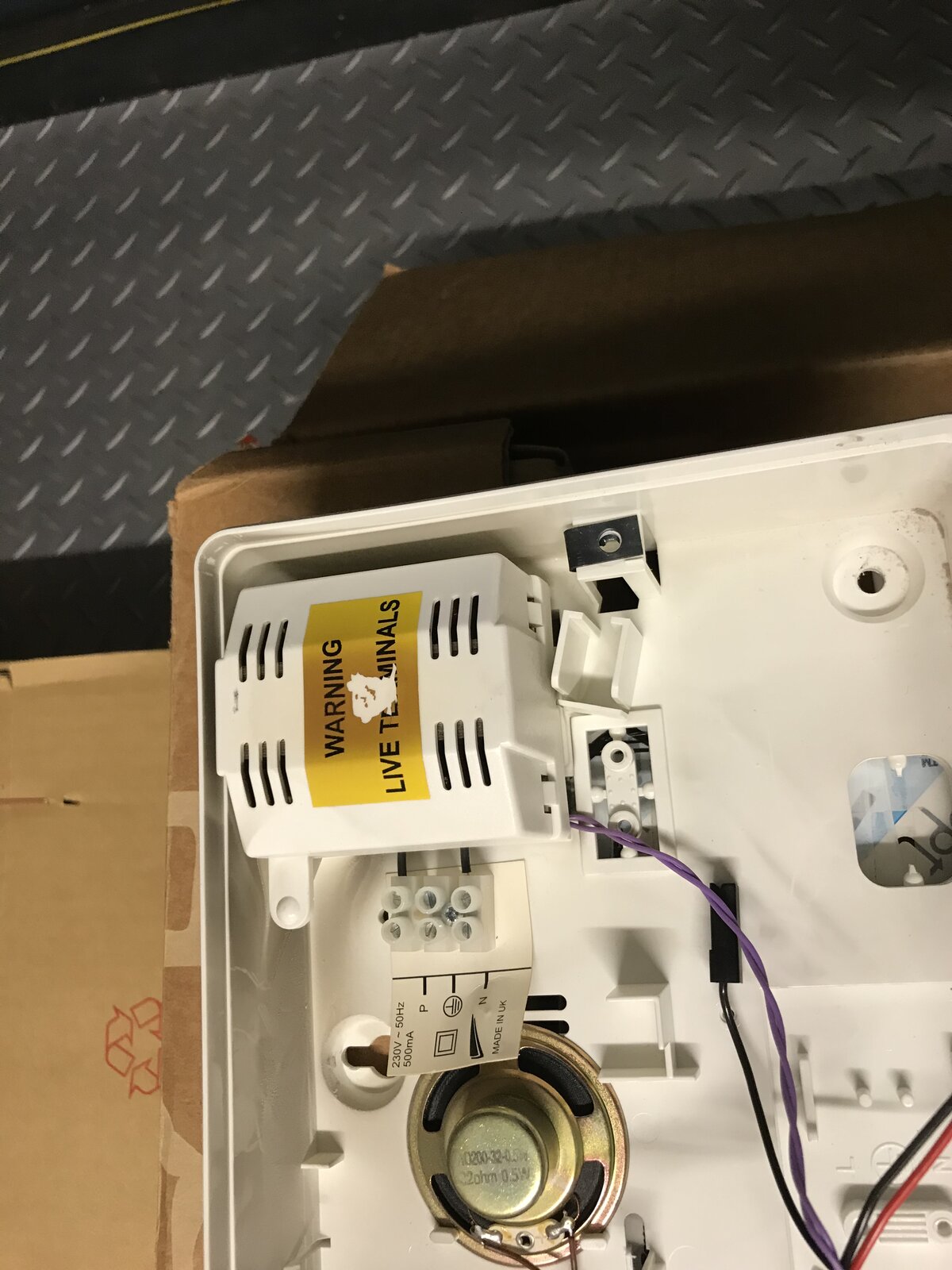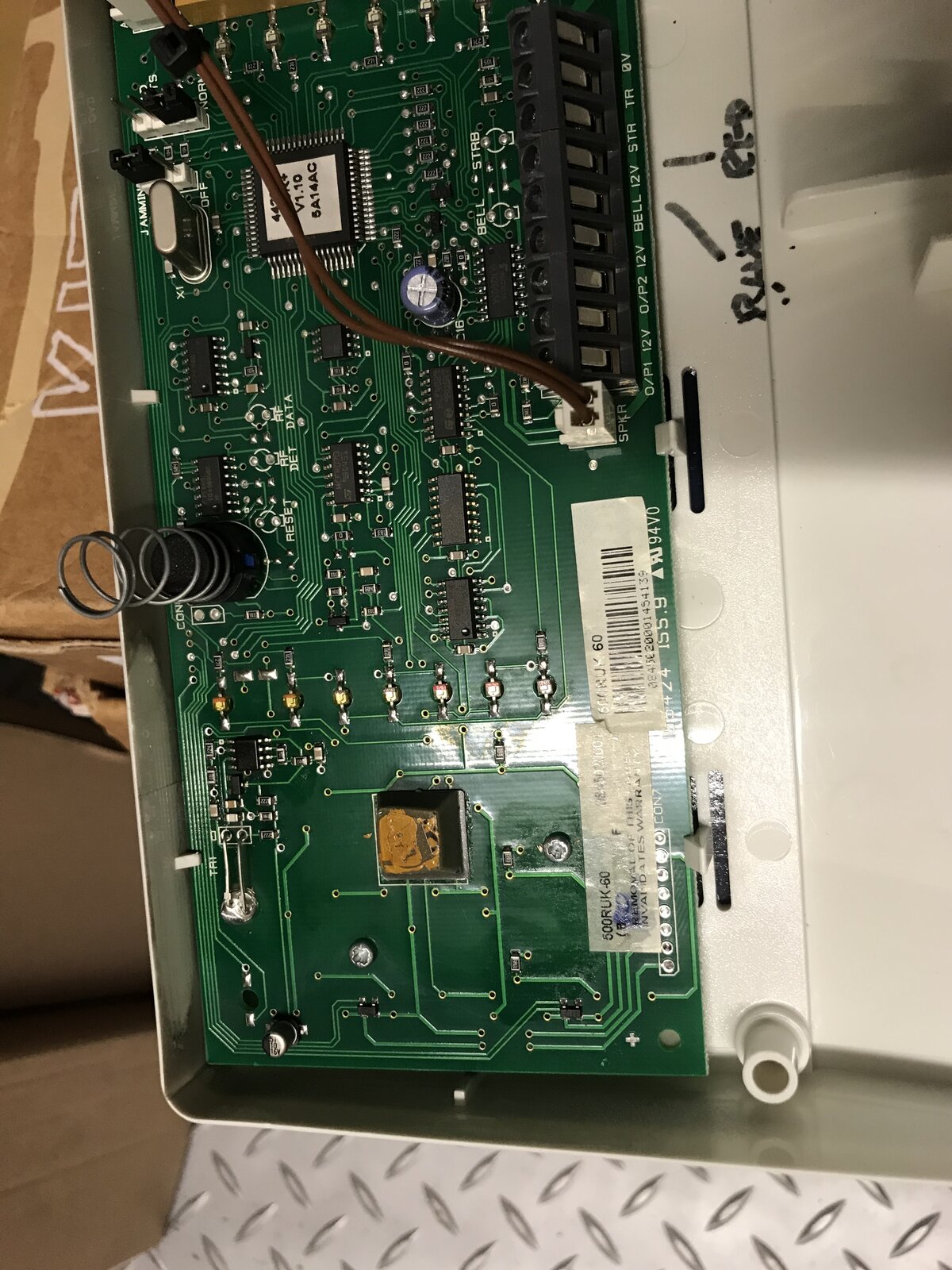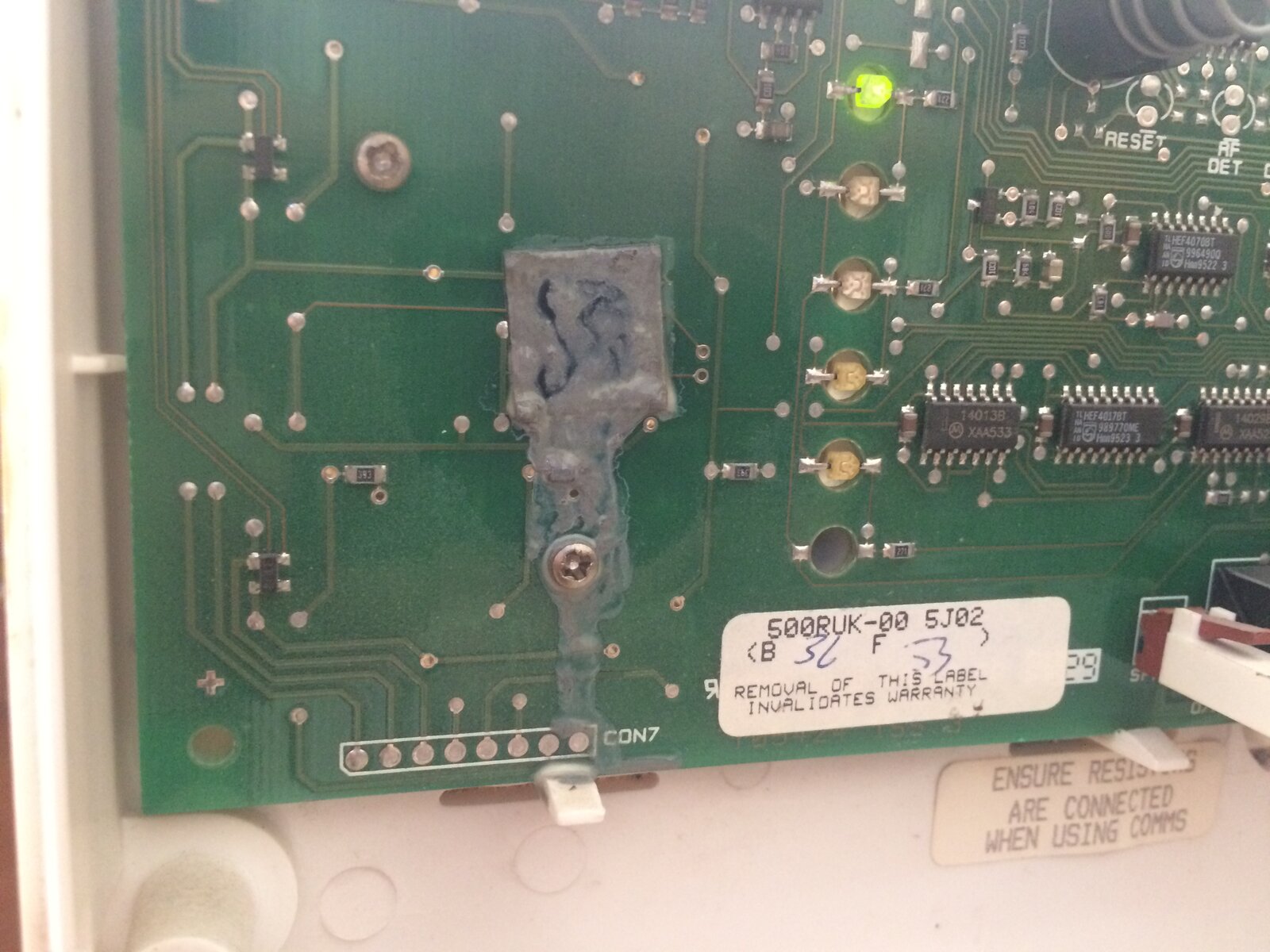 On the inside of the control box door on the left of the circuit board is what looks like a squarish grey melted area that has run down the circuit board like wax. This looks pretty catastrophic to my untrained eye and possibly spells the end for this alarm system?