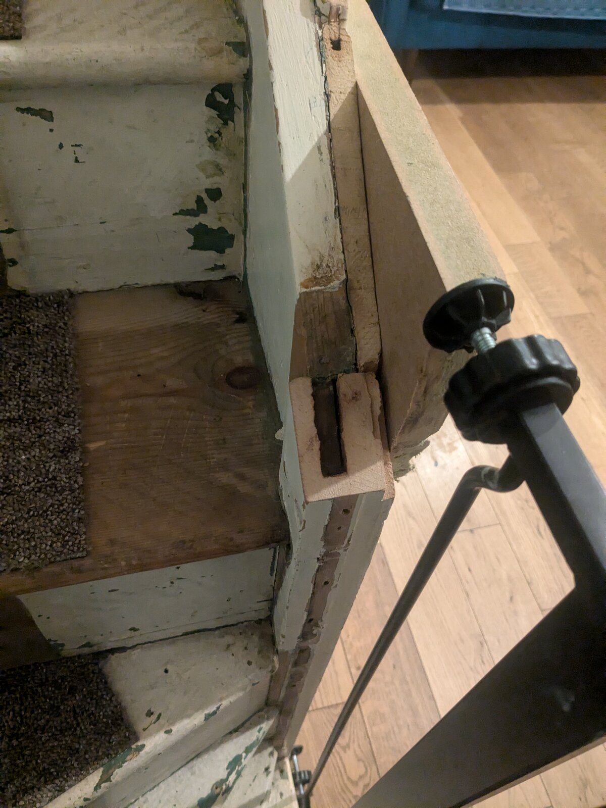 Hello all. A fresh newel post is desperately needed here. It seems to me that removing this old thing is out of the question. Am I right in thinking a new post should be cut nearly into the stairs and butted up to this existing one? I am worried the handrail wouldn't line up with the stringer however. Please help!