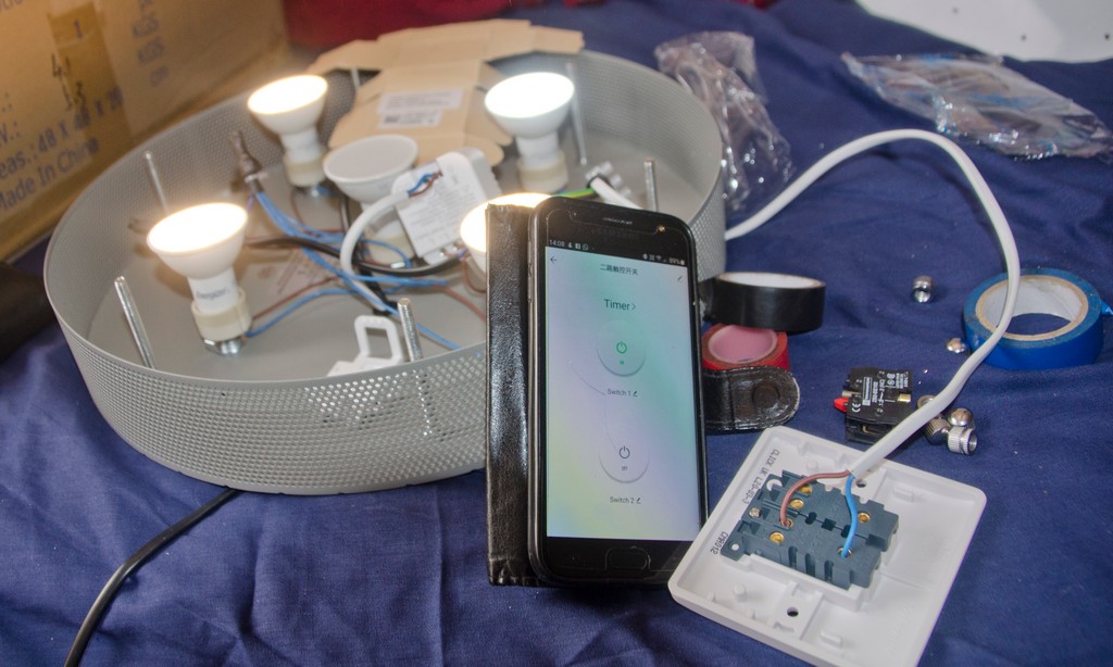 This DSC_6058.jpg DSC_6059.jpg is the lamp waiting to go up, wife likes the dangle bits that attach, but I have split the lights one inner and four outer and intend to use colour changing inner lamp. To do this I am using a smart relay, DSC_6061.jpg DSC_6062.jpg this means the light switch and phone work like a two way switch, so can turn off with switch and back on with phone, and also set times for auto switch on/off, not decided yet if going to replace the single gang switch with double, or only have wall switch work outer lights.