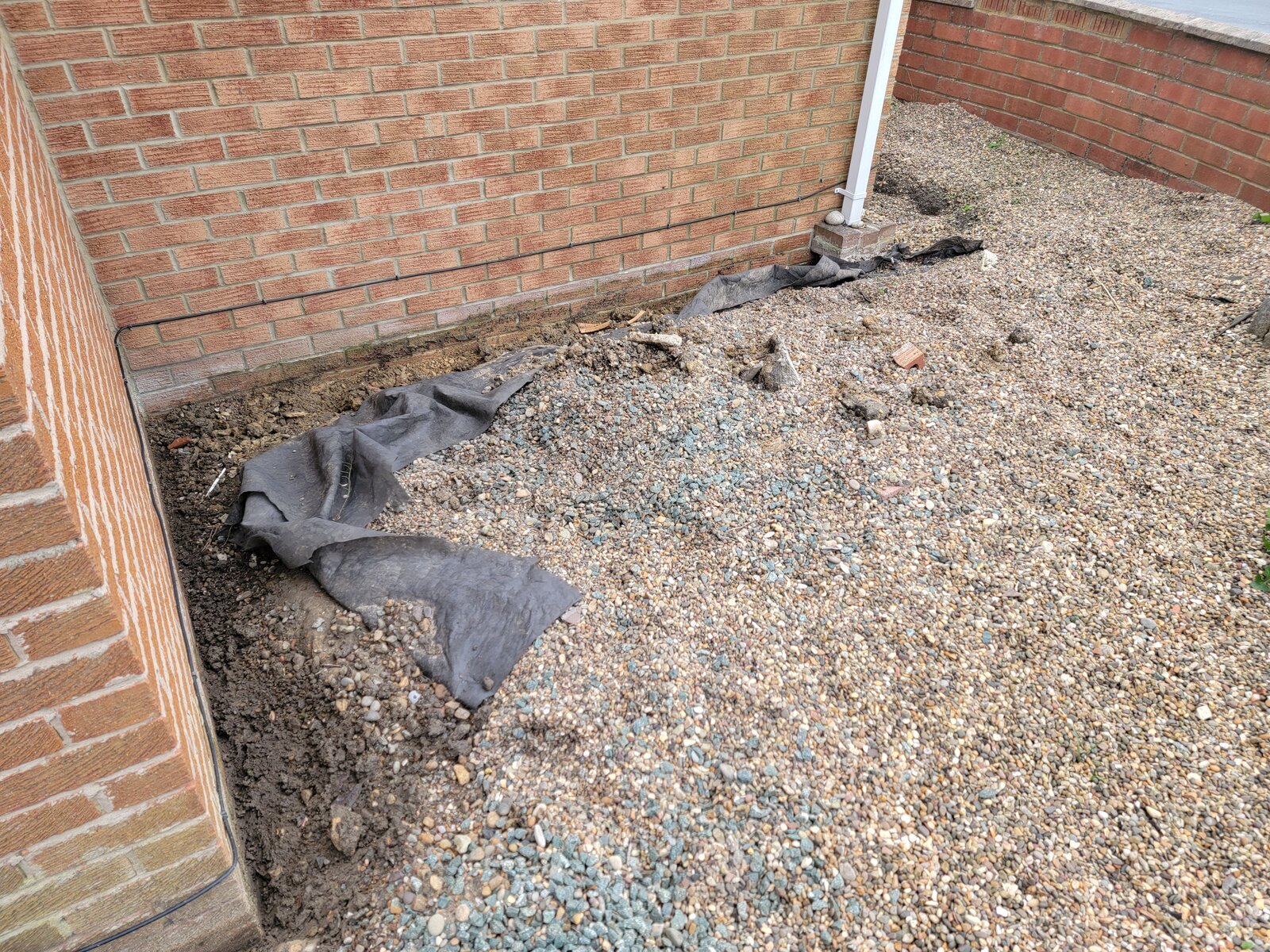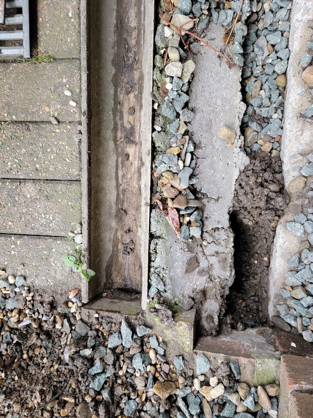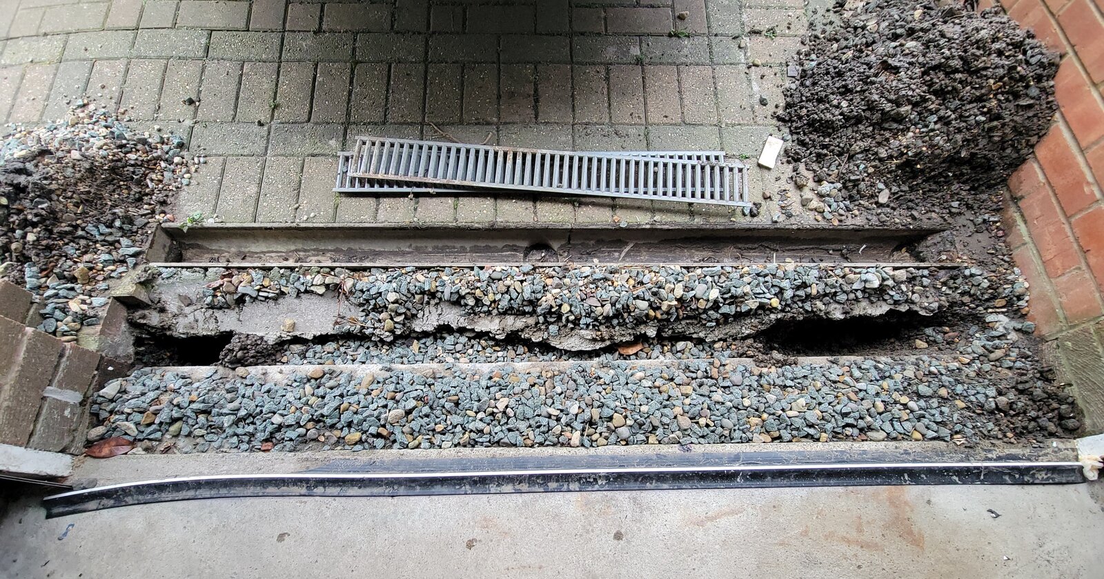 There's an ACO drain between the drive and garage, but it goes nowhere, water just sits until it overflows into the gully below it. That is just filled with gravelly soil which soon becomes waterlogged.