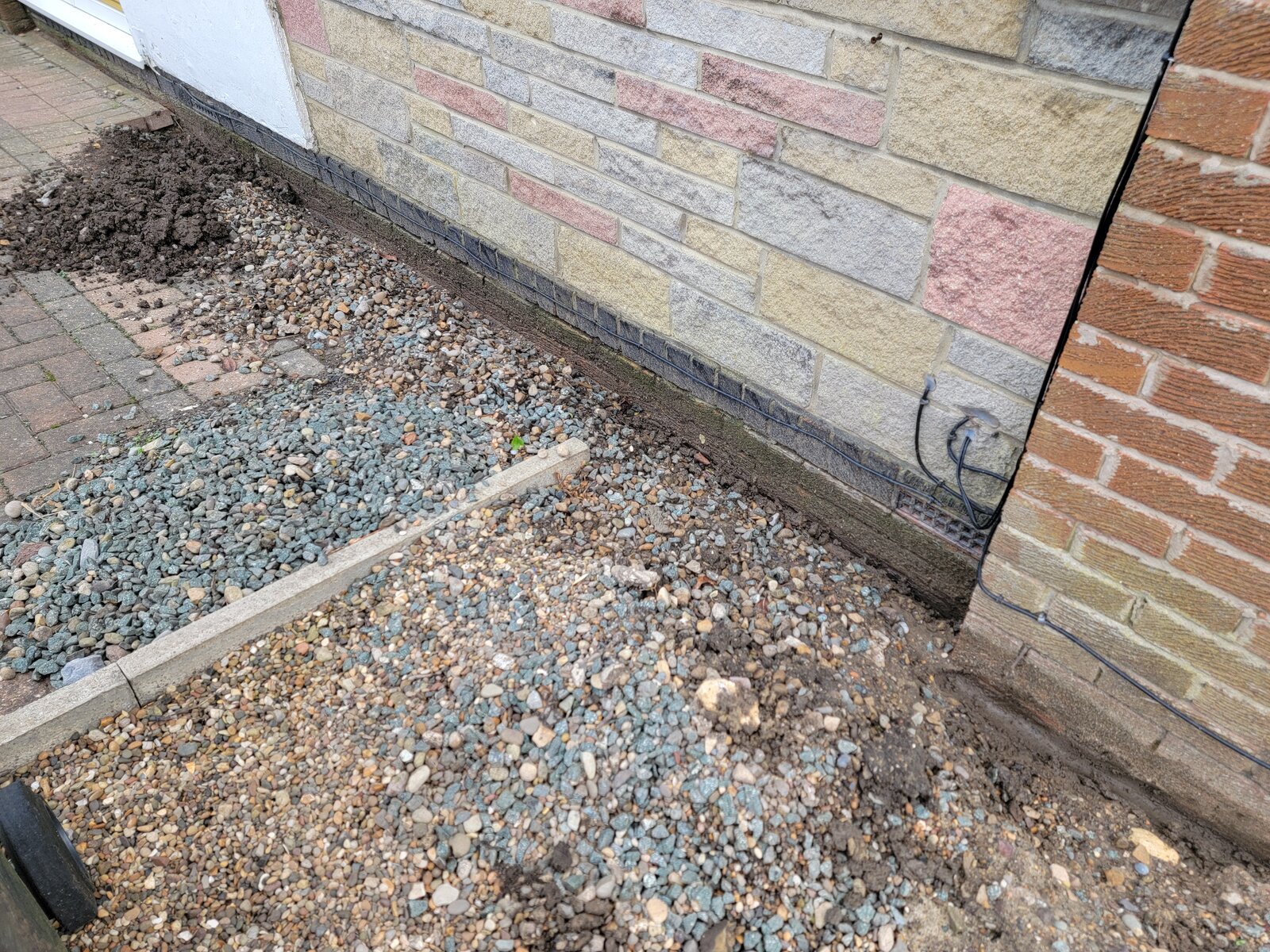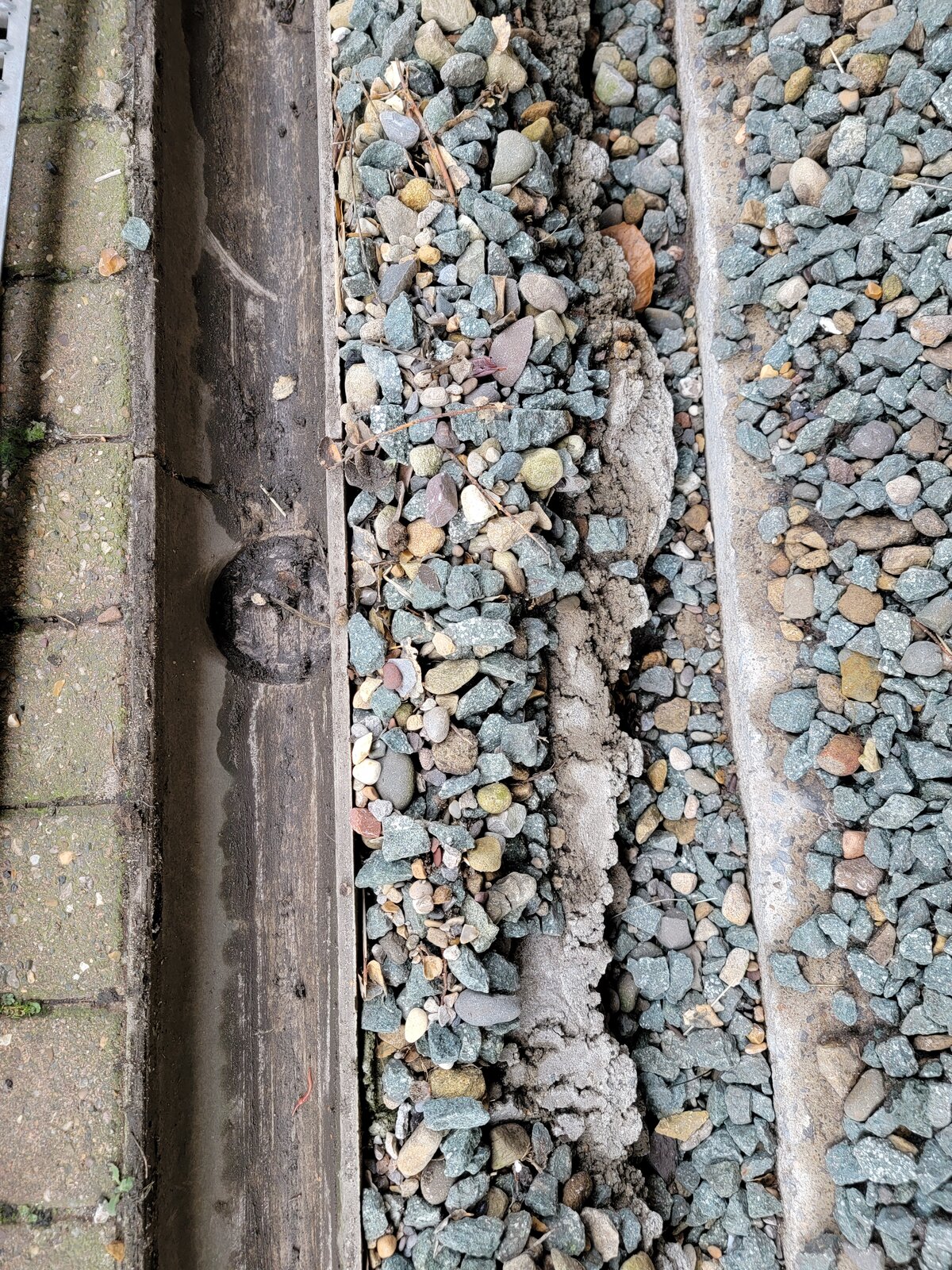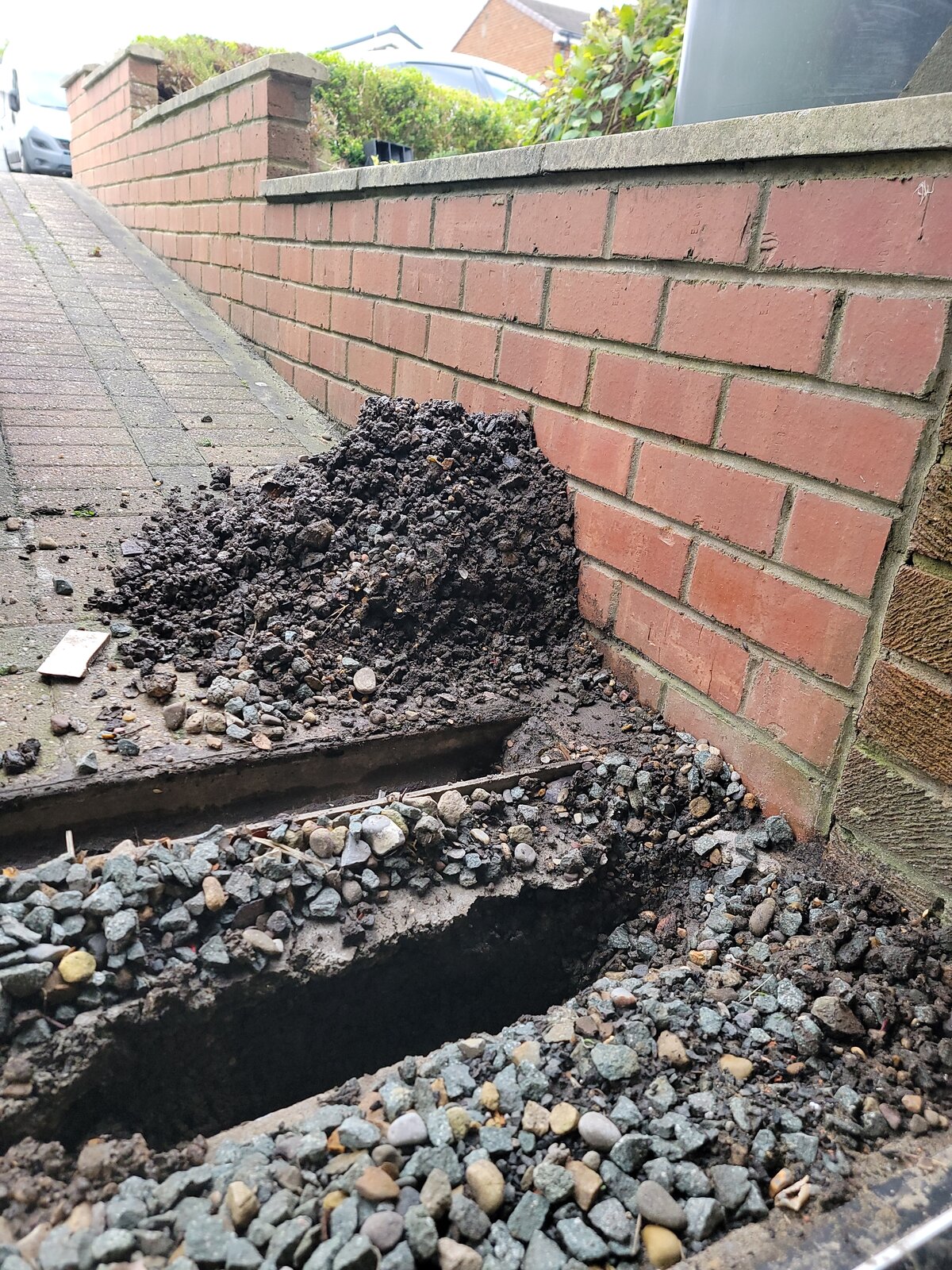 There's an ACO drain between the drive and garage, but it goes nowhere, water just sits until it overflows into the gully below it. That is just filled with gravelly soil which soon becomes waterlogged.