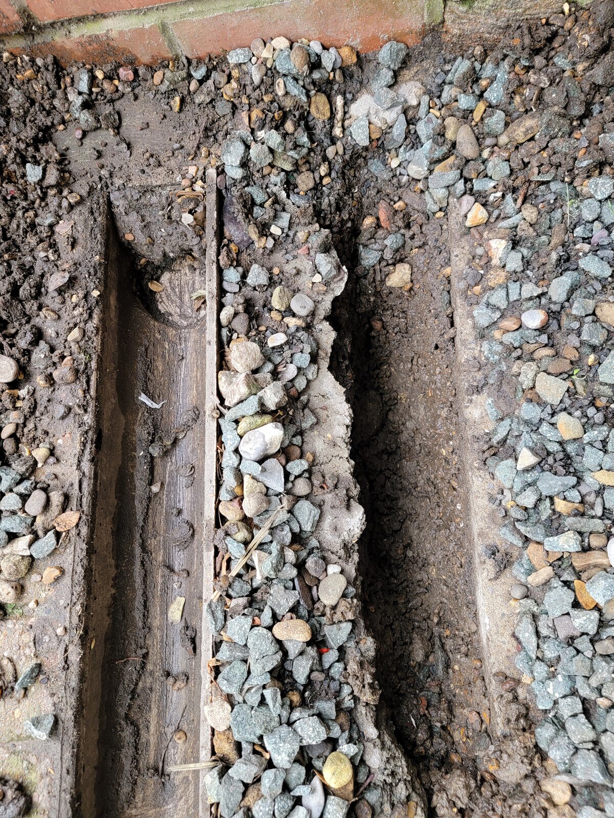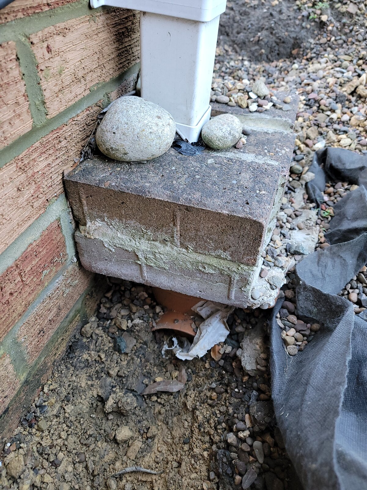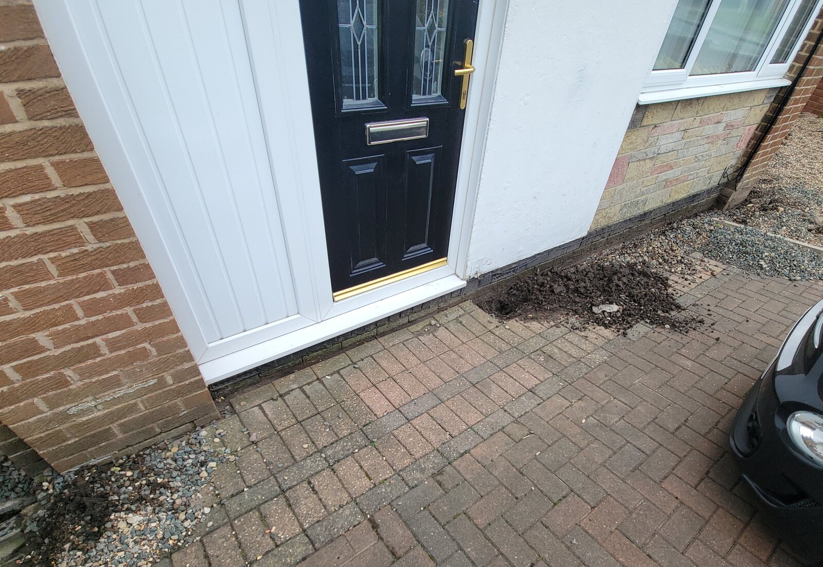 The paving outside the front door pools with water and the gully along the front of the house does the same. There's no apparent connection under the block paving between the garage gully (to the left of the front door in the picture) and the gully to the right of the front door. The ground all falls away towards the downpipe on the extension but there's nothing actually connected, no French drain/ buried pipe or anything.