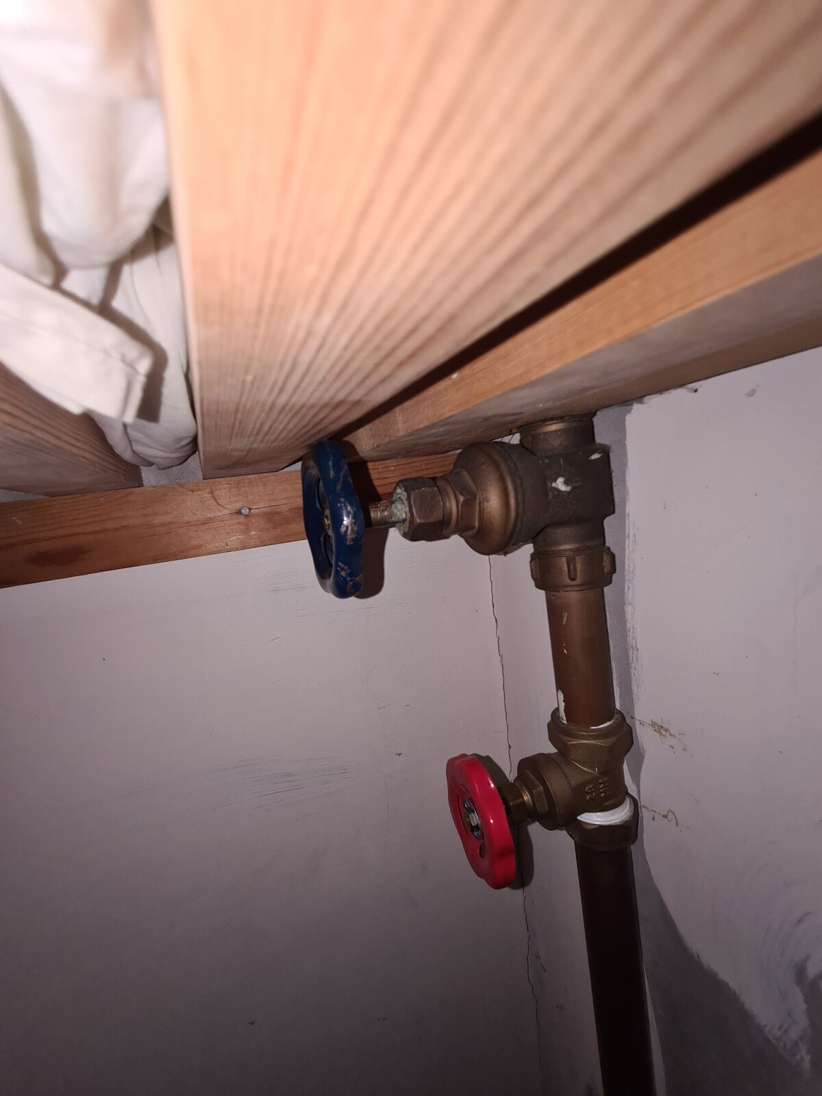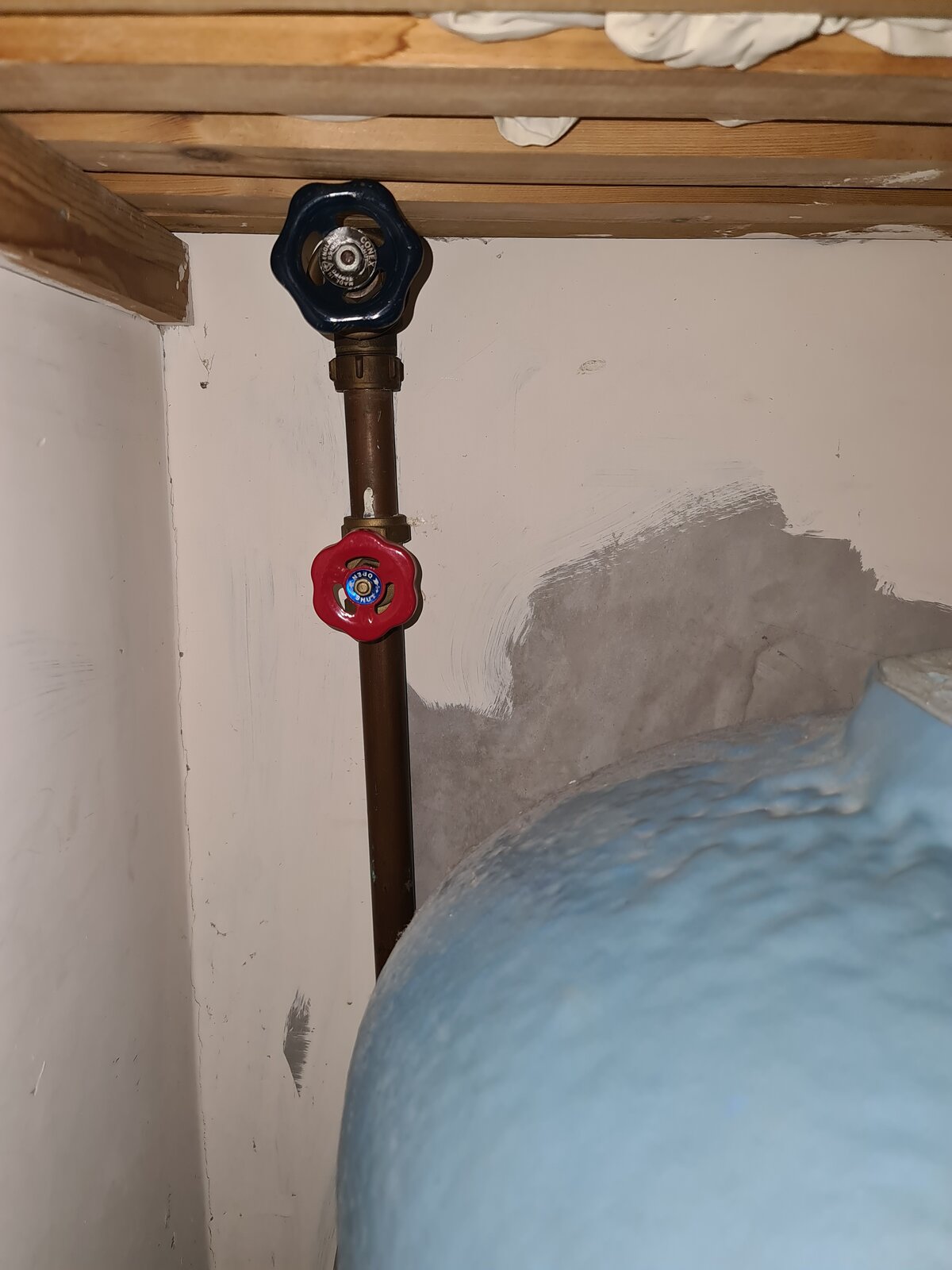 A plumber came earlier today to install a new bath tap shower unit. As the bathroom cold water is served from a cold storage tank in the roof of of flats there is a separate stopcock but he couldn't turn it so abandoned it for the day. Problem is none of the hot taps are now working! Does anyone know what I'm supposed to do to turn it back on. The stopcocks in this picture would feed the tank at the base but I can't see anything in the pipe which comes out the top?