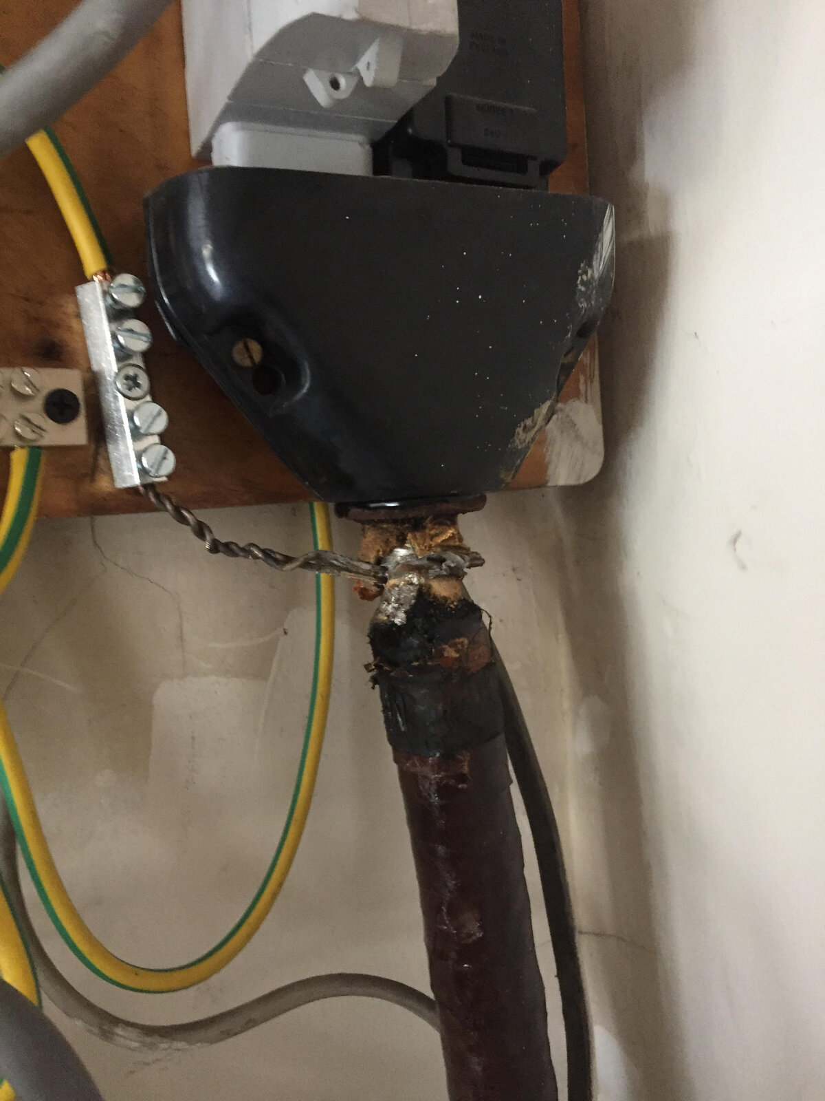 An electrician had previously incorrectly put a pipe clamp on the armour, but when a new meter was fitted, the iron service-head was replaced with modern grey plastic, the fitter stripped back the armour and put an earth clip on the lead sheath. I had an idea they would change it to PME, but I don't think they did. I wrote and asked if they would, and they said yes, but only if I had an EICR done first.