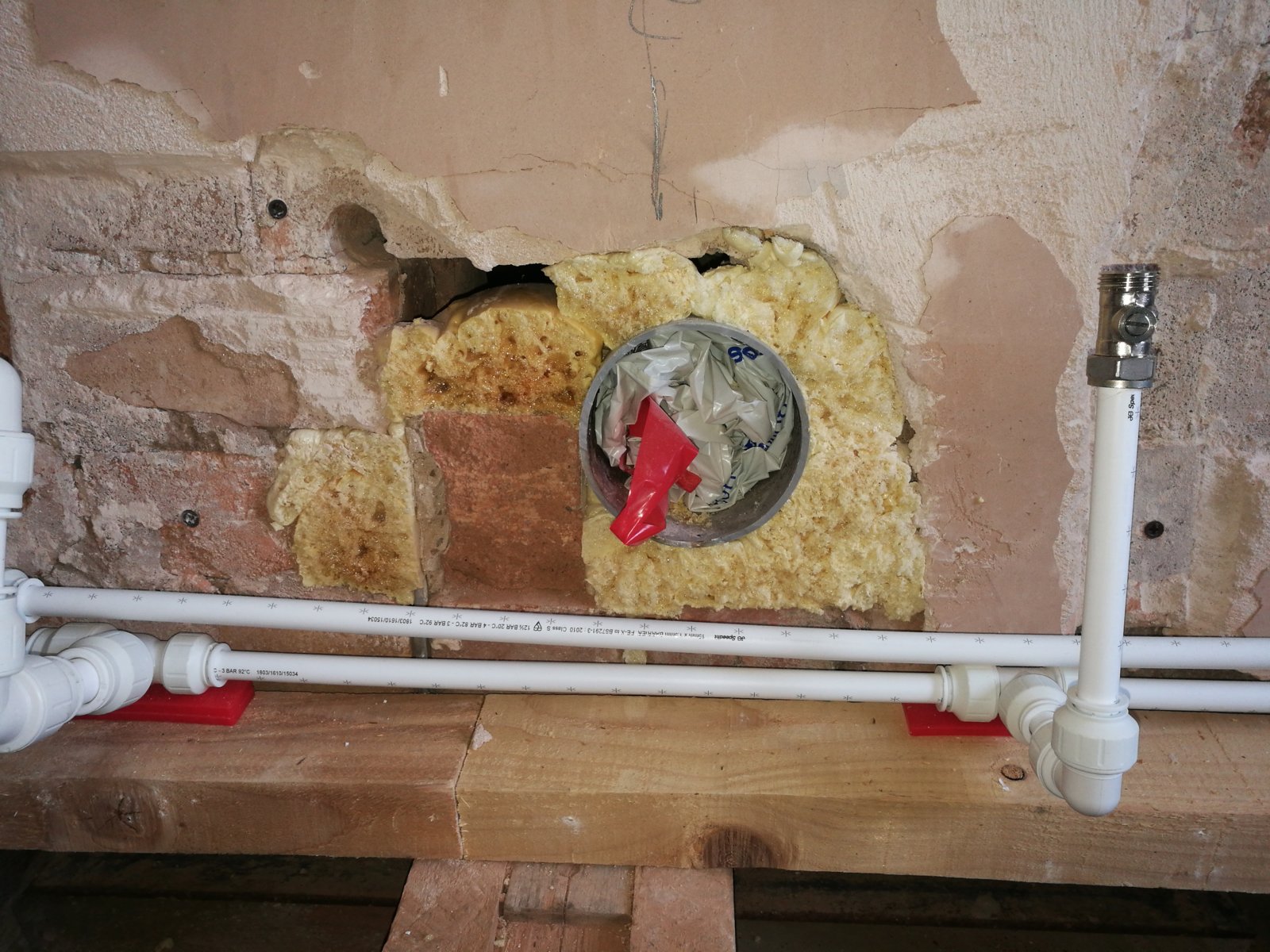 2. The hole for the 110mm pipe through the external wall is more like 300mm x 200mm and has been partially filled with a few broken bricks and ALOT of expanding foam from the inside, and nothing from the outside (solid brick wall 2 course).