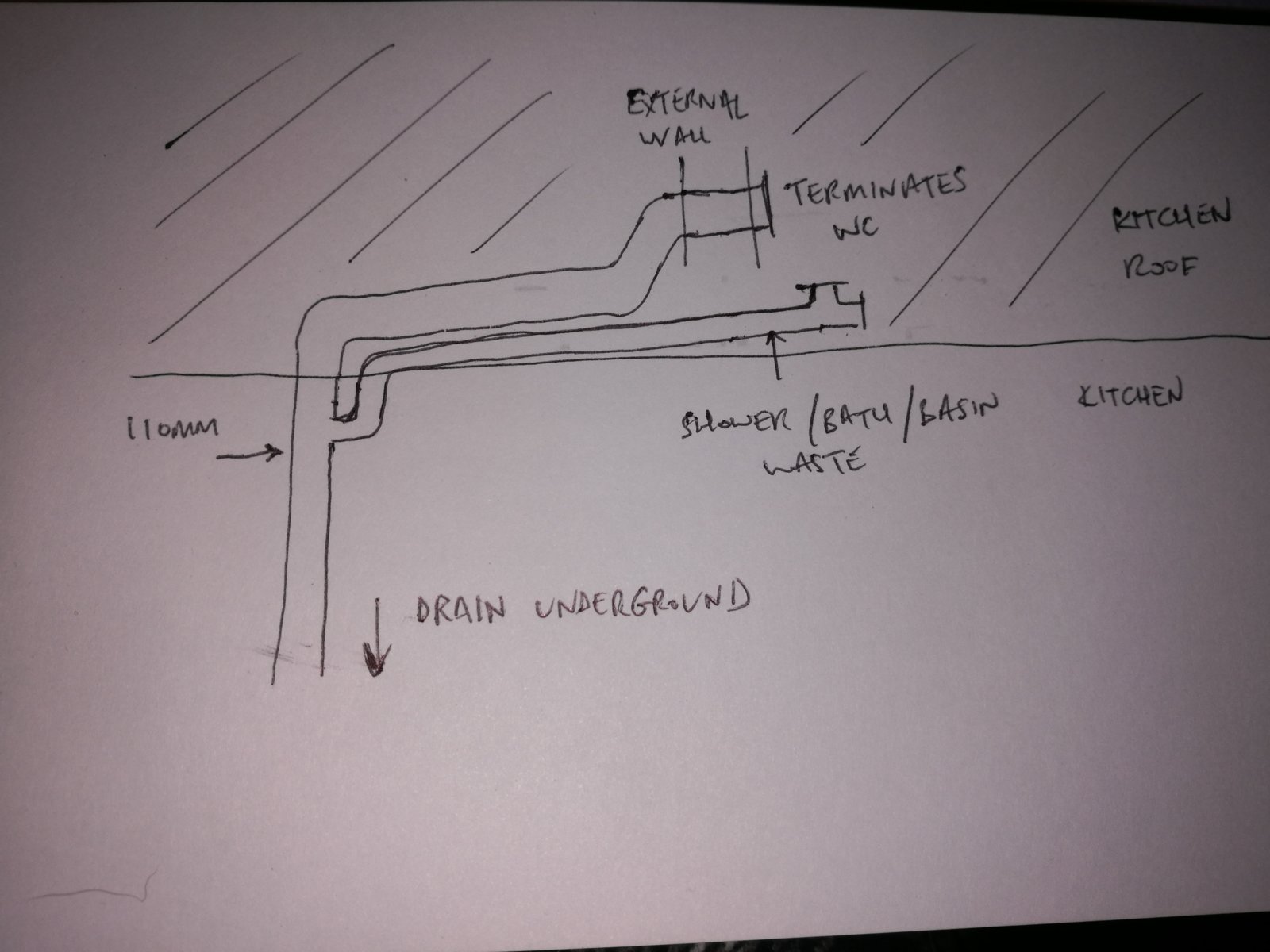 I've finally got an unobstructed view of the entire soil pipe running from the corner of the kitchen, up in to the kitchen extension roof space, along the external wall and through in to the upstairs bathroom