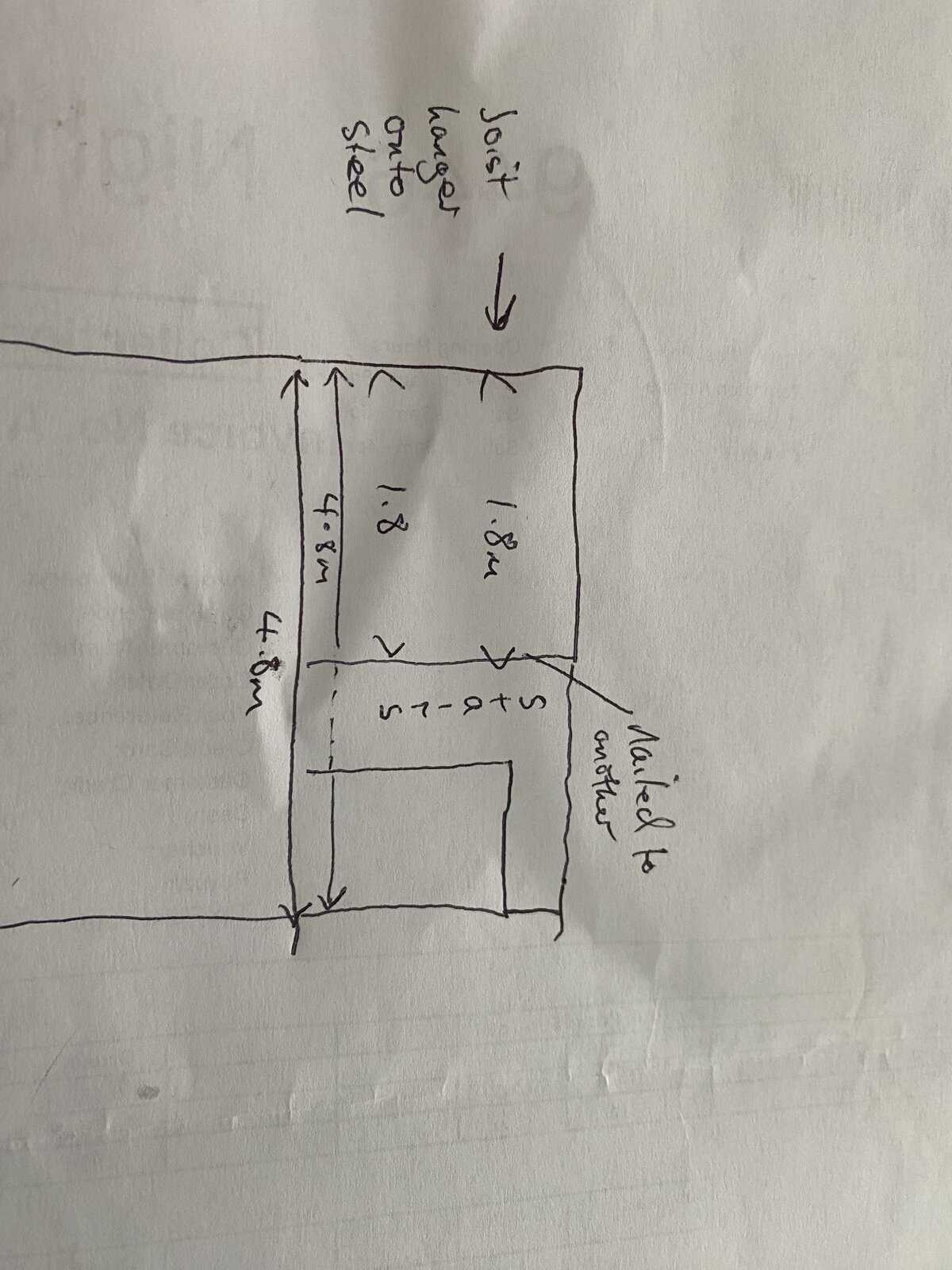 I’ve added some pictures. The drawing shows the layout and the first 3 joists run to 1.8m. They’re connected into a joist hanger on one side (onto wood block in the steel I beam). On the wall side by the stairs it looks like they’re just nailed in to another joist running the other way. I think this is connected into one of the longer joists.