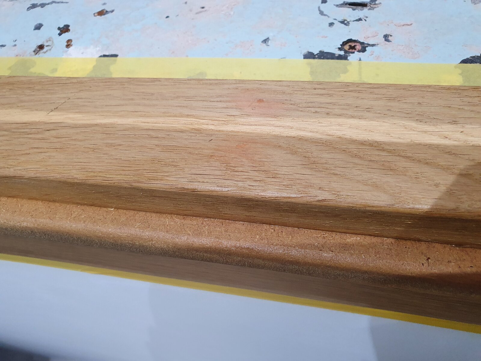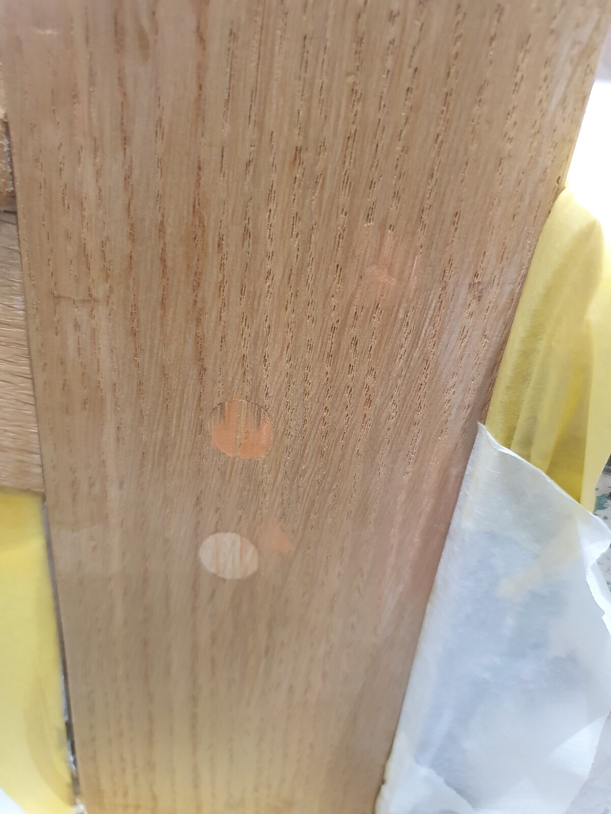 tinted touch-up paints. In the photo above the use of an inappropriate colour of filler (and over filling) is very obvious - the filler is lighter than the oak and possibly a bit too red. Doingbthis the dowel will still be visible, but should be less obvious