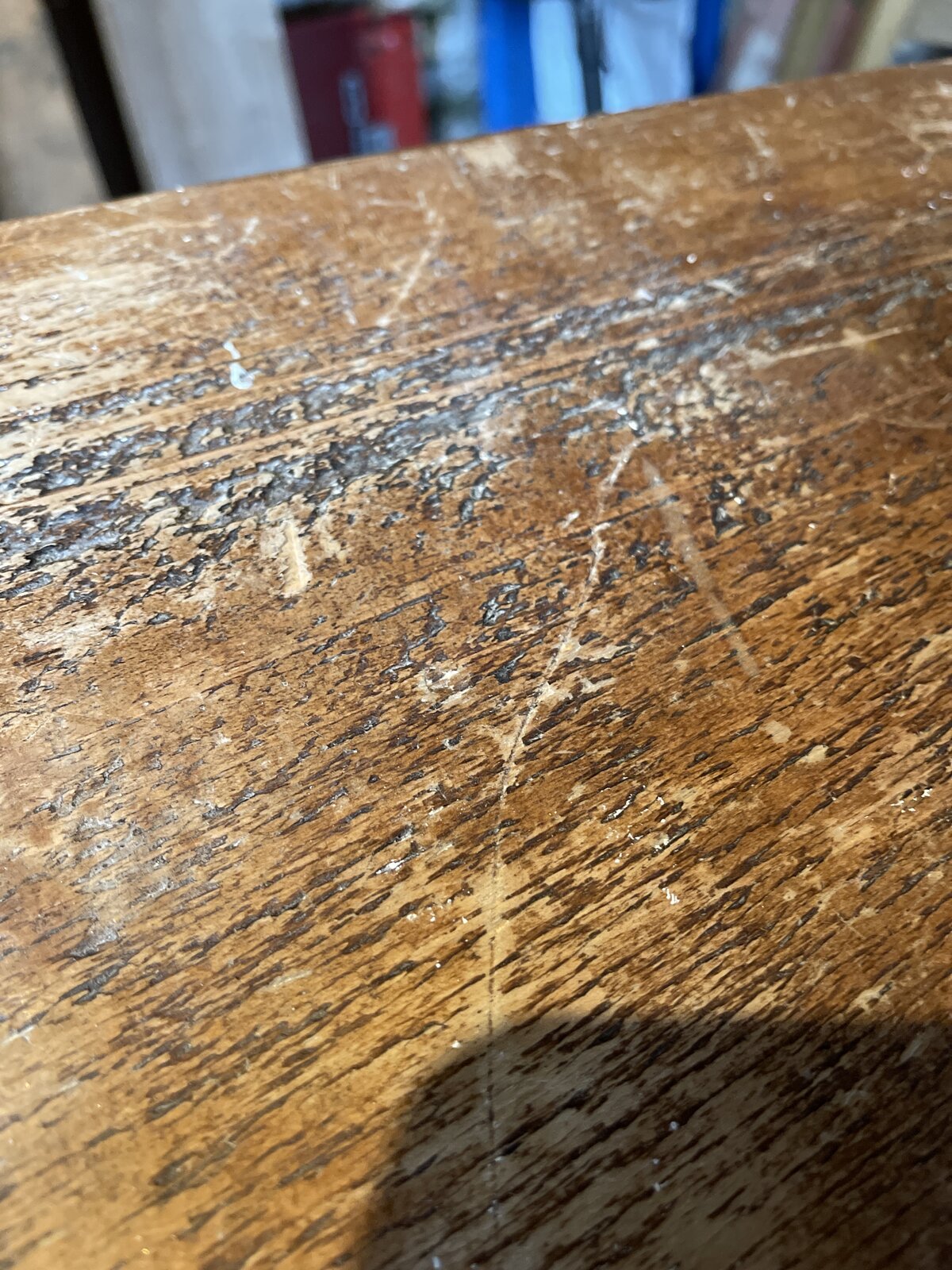 I want to refurbish this solid oak kitchen table that has had quite a bit of abuse. It’s got a waxy finish to it which you can easily scrape off with your finger nails. Just wondering the best way to proceed, sand down straight away or try and remove with some kind of stripper.As you can see from the photo, the surface of the table isn’t meant to be smooth flat but has a sort of ‘cork’ effect.