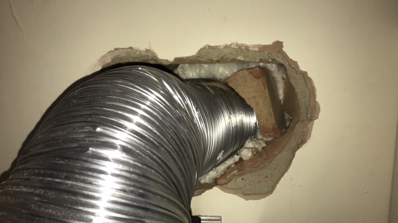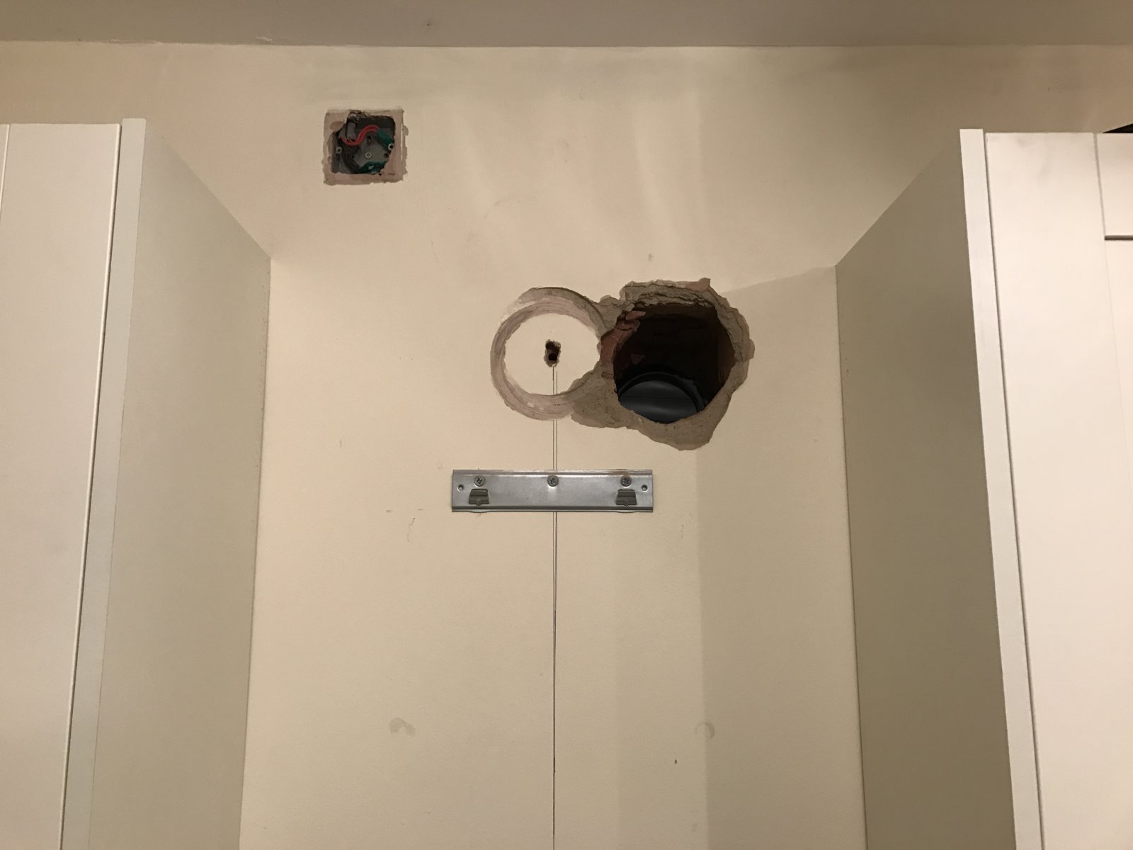 Happily starting to core away for our cooker hood and all the plaster broke off one edge revealing an old hole 140mm of to one side that had been rendered over at each end. Problem is we've already bought, built and fitted all the rest of the kitchen and there's no space left to move anything down. There's at most about 25mm to move the extractor over, the chimney would need to move over about 75mm to fit the ducting behind it. The hole can't really go any higher because of all the wiring embedded into the plaster, besides for it to go high enough to be clear of the old hole you'd never get the drill in because of the ceiling.