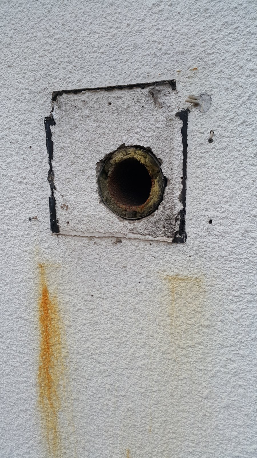 Should I just keep bashing at it or just fill it with insulation and cement over it? I prefer not to leave it as exterior wall is white and this thing is bound to rust?