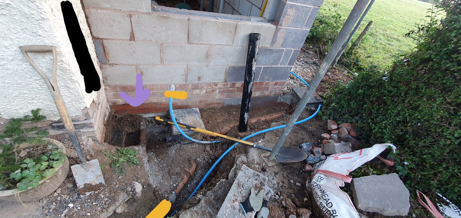 Dug out the ground to where rhe groundsworkers have placed the drain run to reposition the svp.