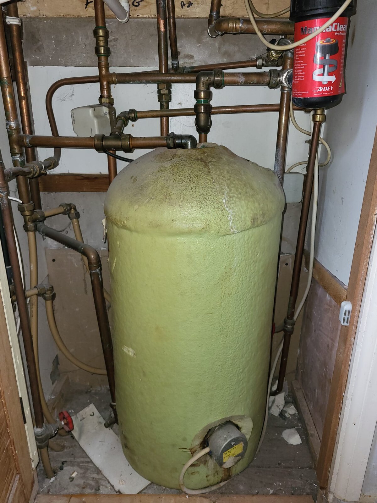 Im very much an amatuer, but does this look like an old immersion element that still exists within the cylinder (bottom center of the pic)?