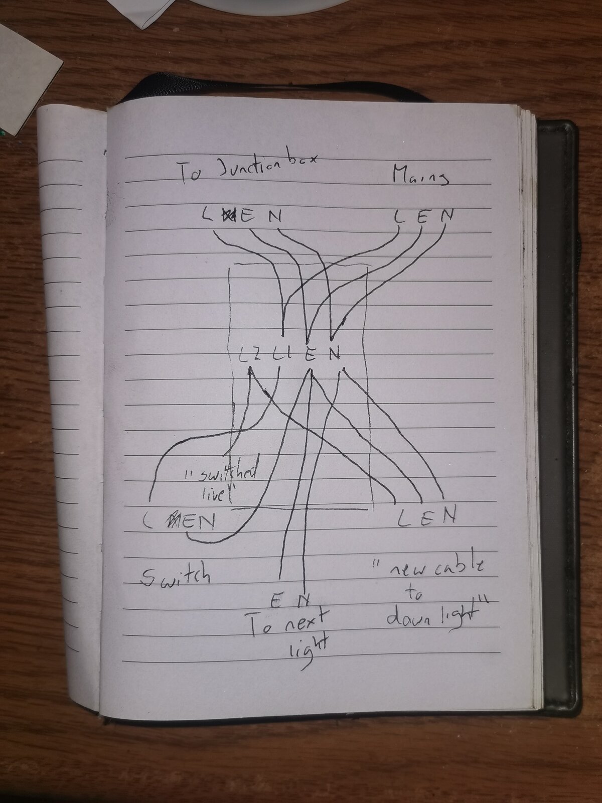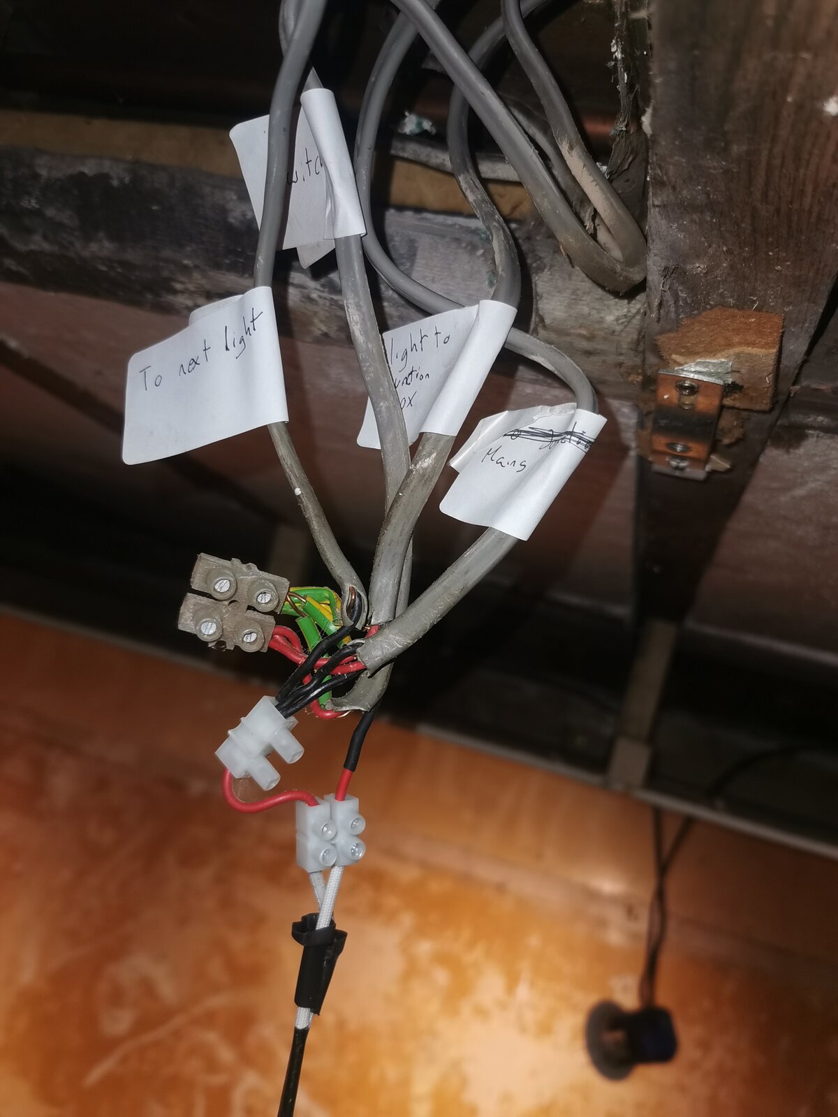 "Light to junction box" feeds to what appears to be a junction box that's a bit out of reach but I could see with a torch.