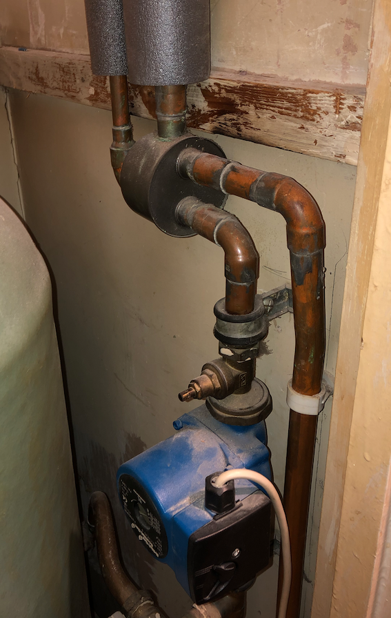 The round chamber with four pipes connected is an Aerjec air separator. Unfortunately they have a tendency to block up. Use a magnet to check the copper pipes near the device (not the device itself). If it sticks, the pipe is blocked.