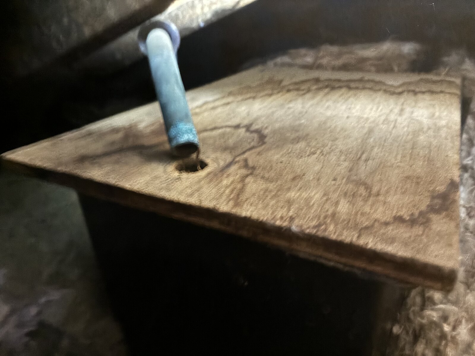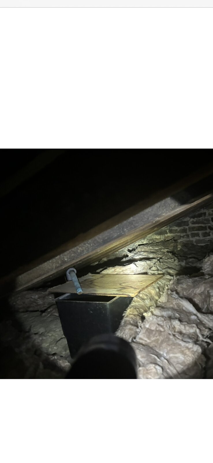 I got up into the loft space to see what corresponds to today's new stain and its give-or-take pretty much by the header tank which had a plywood lid put on in spring 2023. That plywood has evidence of water staining and the hole for the vent pipe is a bit small (IMHO) to line up well so I have moved that sideways to ensure any pumping over gets into the tank!