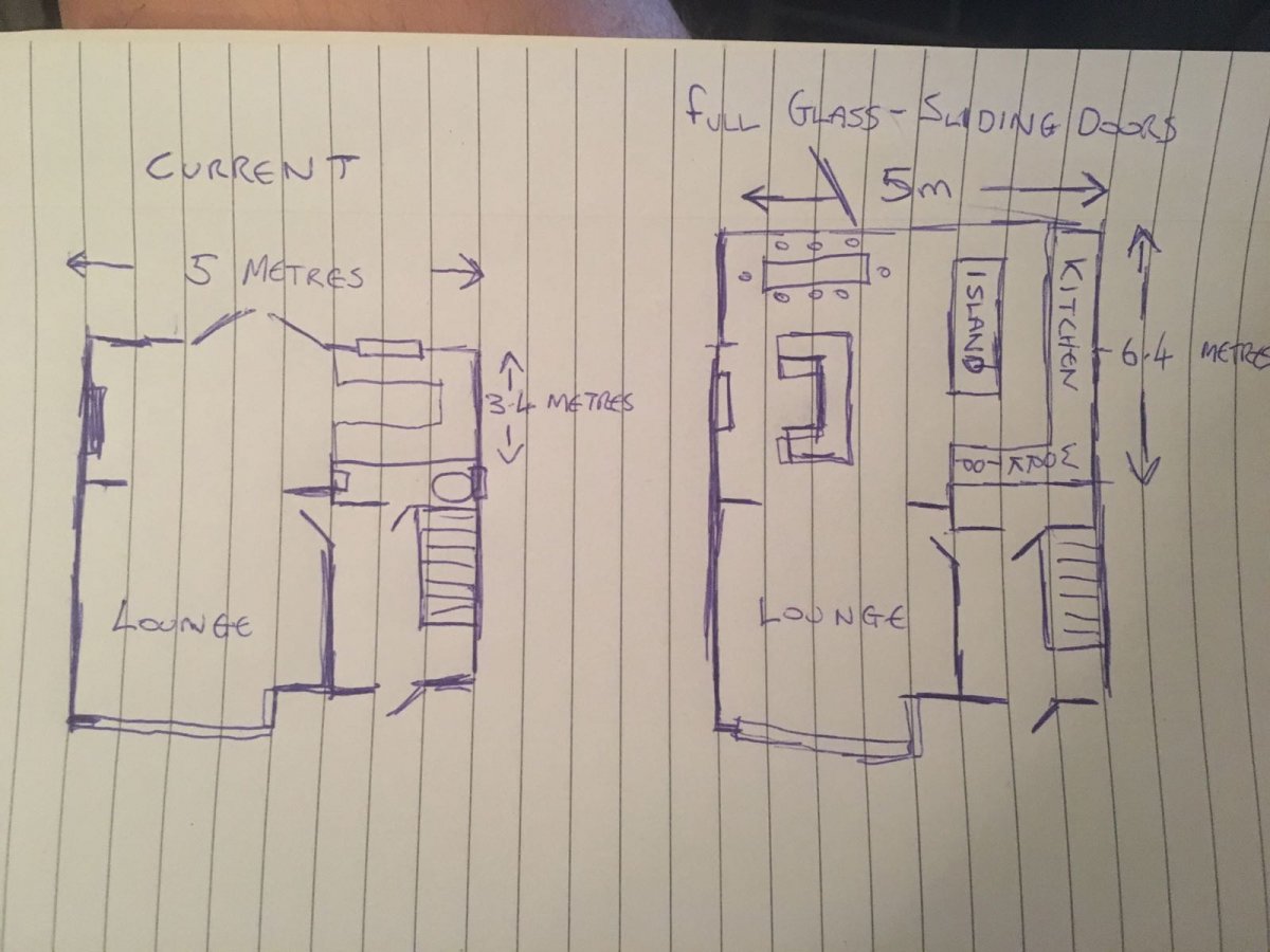 I'd like the rear of the house opened up completely (if it's possible) and the kitchen diner changed from a 5m × 3.4m.... to 5m x 6.4m.