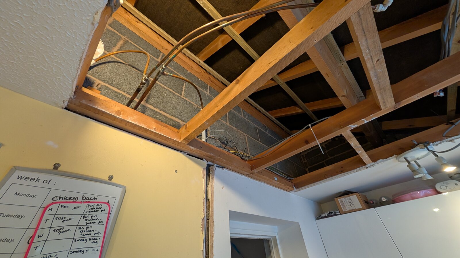 The wall supports an externally wall, the beams run parallel to the wall for the upper bedroom just behind the wall.