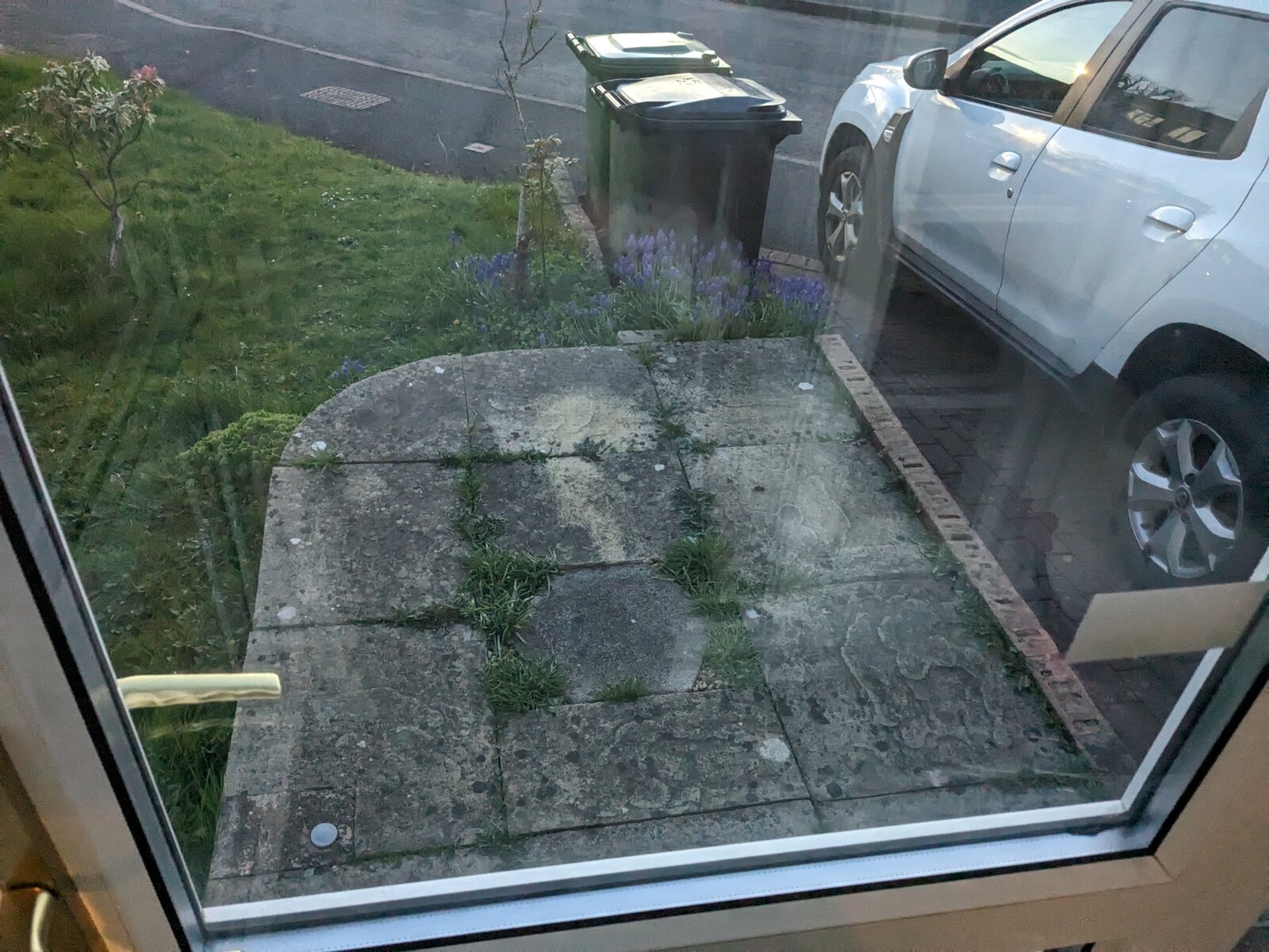 Or... Another plan i could foresee, is to leave the grass alone. Dig out the "patio steps" and the bit of grass between them and the pavement and replace with block paving at the same levels and slope as the existing driveway, effectively making it wider by 2 meters. Make a nice smallish crescent step out from the house.