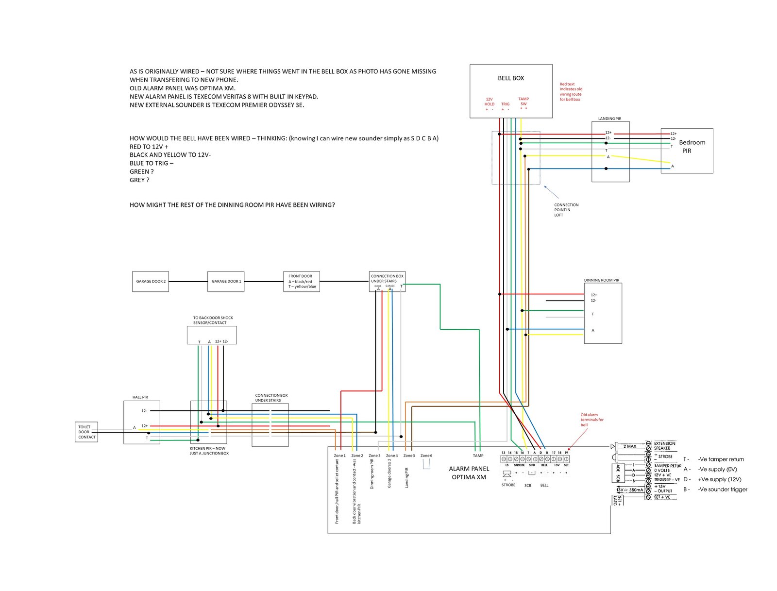 The old alarm panel was an Optima XM and had a PIR in the dinning room, that works with just 1 wire to zone 3 and somehow worked via the bell box tamper to 0v – but I’m not familiar with this type of wiring (have only done my own Texecom Premier Elite install).