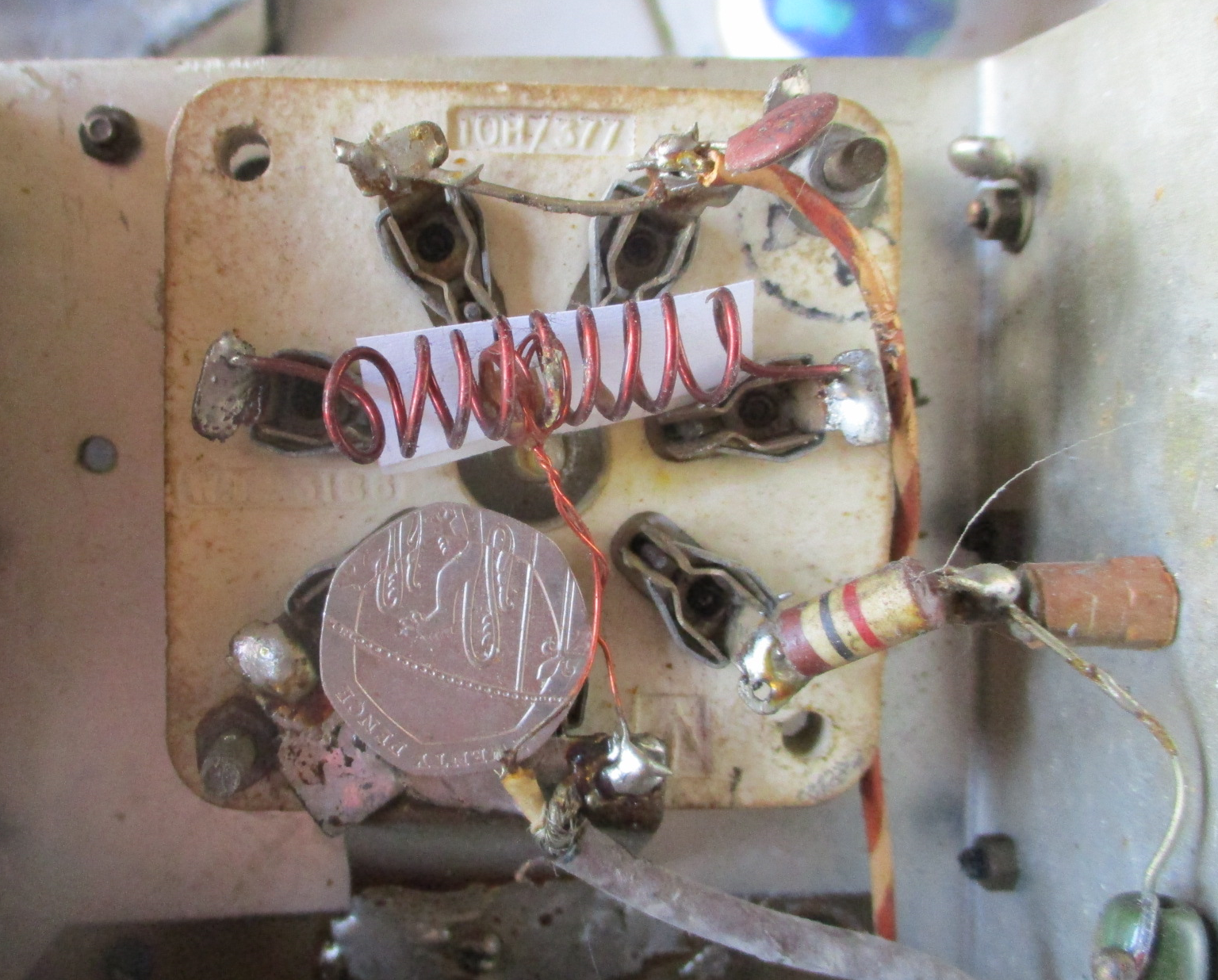 A "2 metre coil" is, of course, not necessarily a coil at all. What I posted before was the 'input' tuned circuit. If I turn the (dusty/rusty!) box over, you can see that the 'output' tuned circuit has a 'coil' which is not quite a single turn - just two copper rods, joined at the end ...