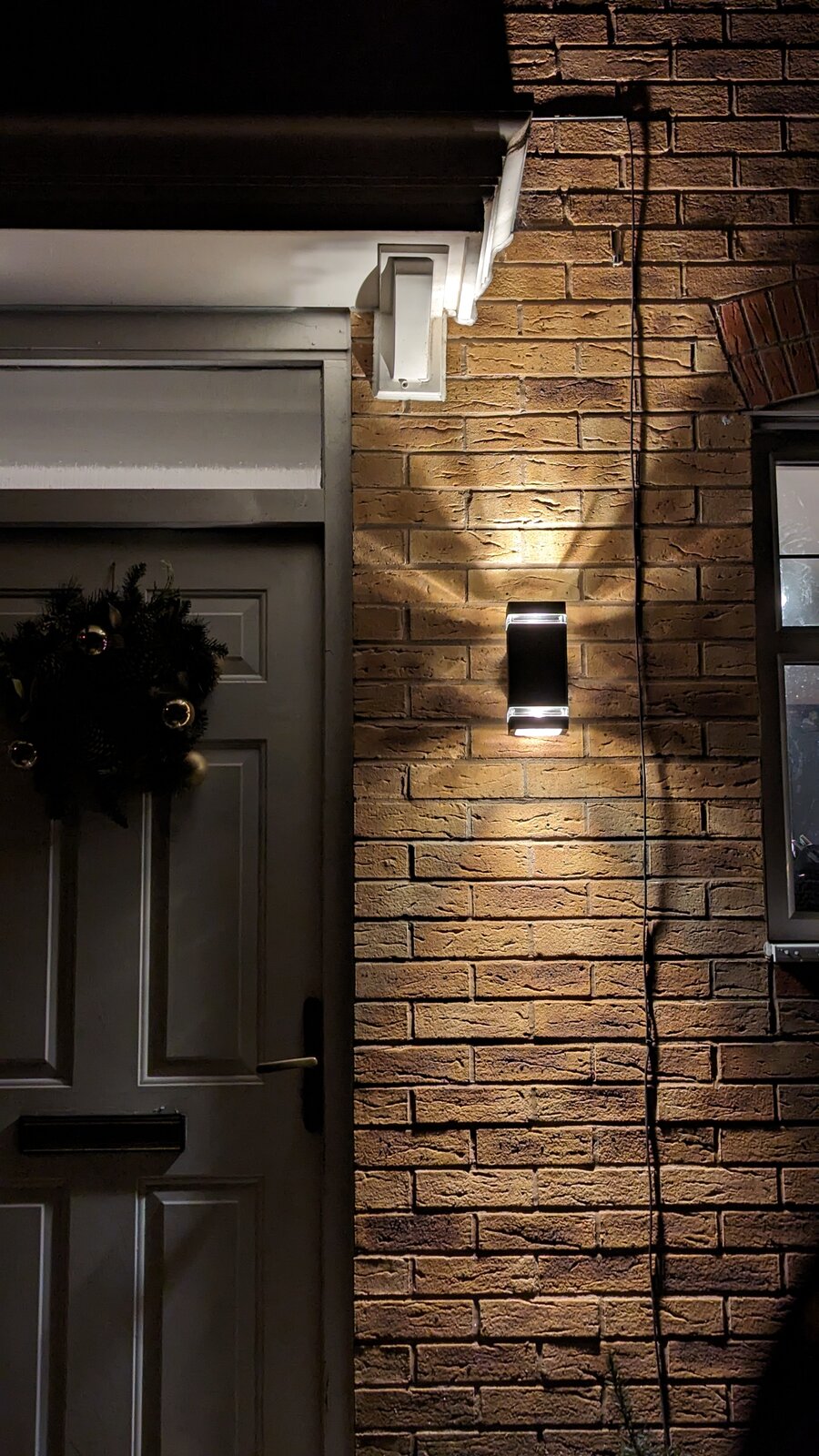 seems to indicate to me the possibility that this may be due to the lights being wired in series, with symptoms I have encountered myself with LEDs in series. Such an arrangement fits perfectly with my assessment of the information presented before me, I started with studying the pictures and worked out the most likely original circuit, then worked out the most likely errors and solution, then studied this before making any comment:There has been an occasional quirk over the past 18 months of the outdoor light coming on when the internal hallway light is switched on. When this happens there is a flickering and change of brightness on the hallway light...