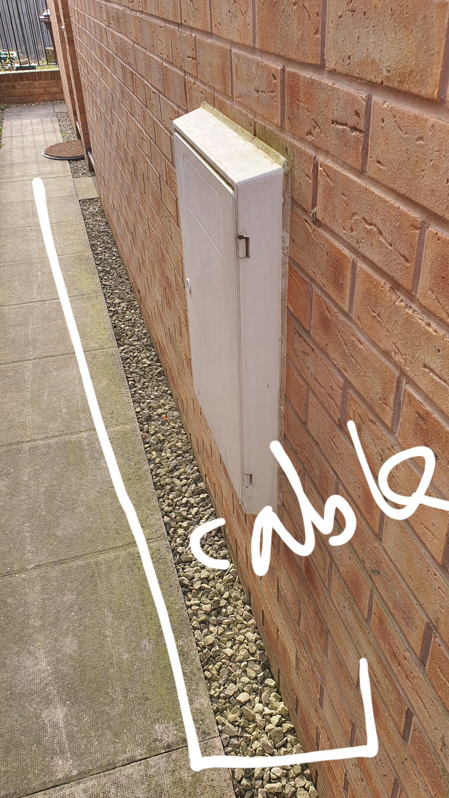 At the side of the house is the integral garage and the consumer unit is on the outside wall within the garage.