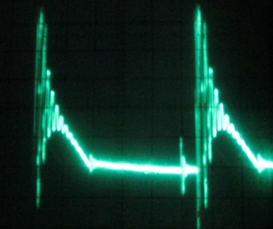 Further to the above, and as one might expect, when one increases the load (this is about 360 mA, i.e. about 4.3 W), things get somewhat 'cleaner' - that 'pulse' is around 30mV at its peak.