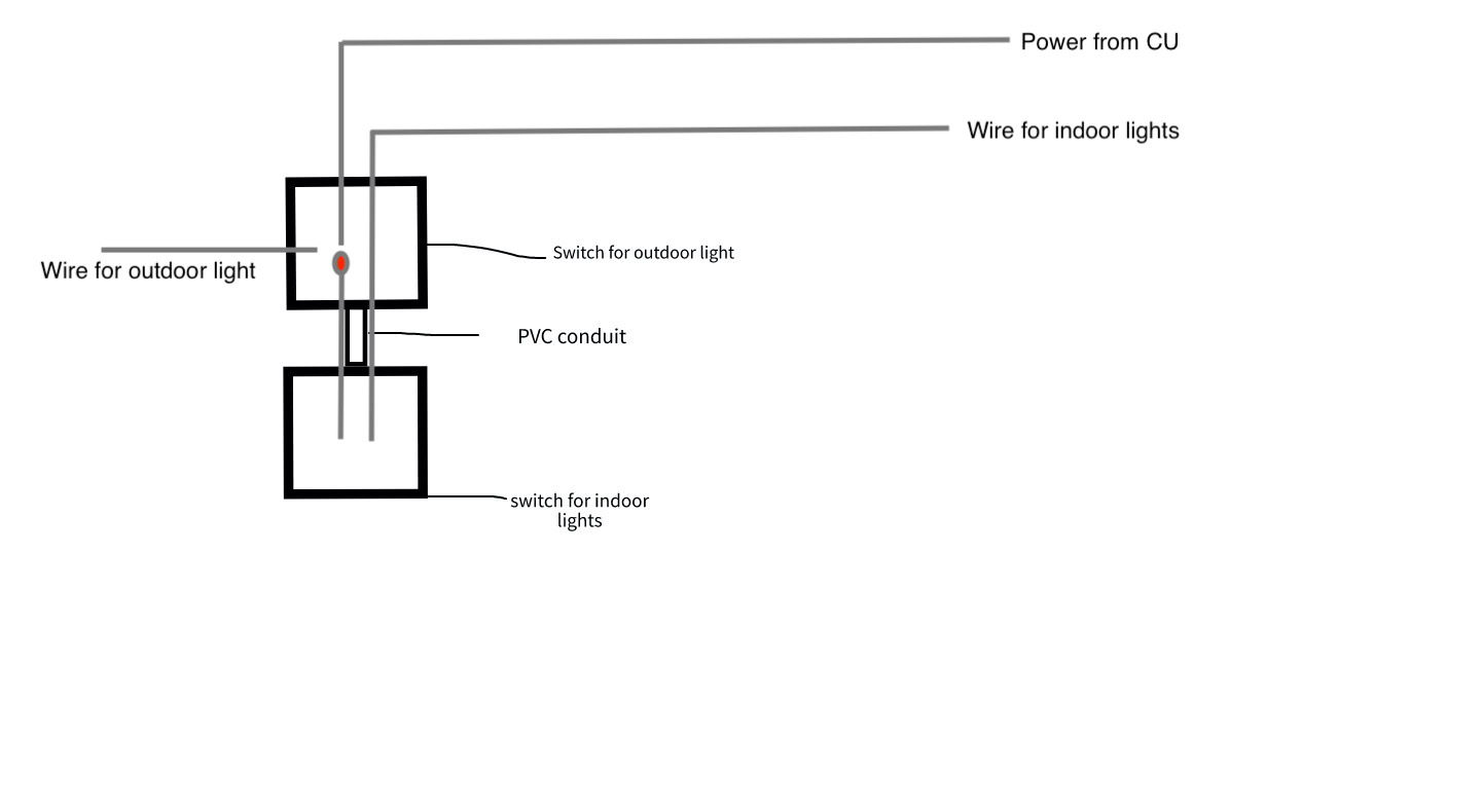 Anyway, he came round yesterday and told me where to put the switch for the indoor lights and also said he wants conduit coming out of the top of it and connected to another switch like my diagram. I didn't think much of it whilst he was telling me, but now it's blew my head away.