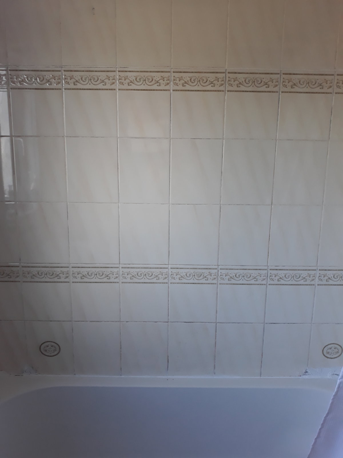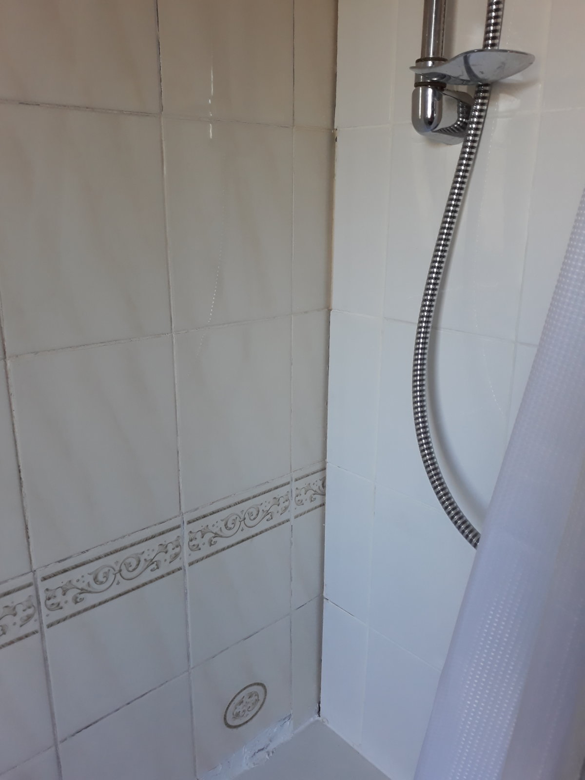 this is the shower wall you can see the new tiles, they are all loose and the only holding them together is the grout.